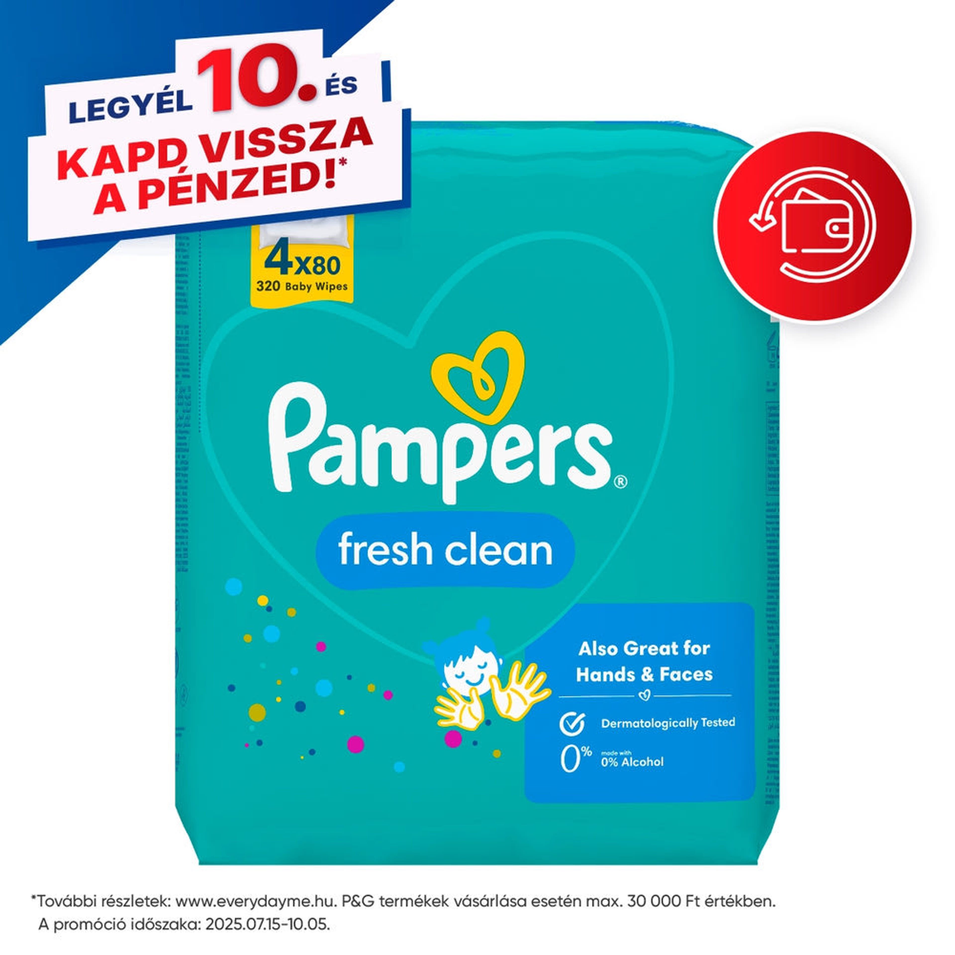 A kisbabák finom bőre gyengéd tisztítást igényel a legérzékenyebb testrészeken: a popsi, a kis kezek és az arc területén. A Pampers Fresh Clean nedves törlőkendő puhább és vastagabb anyagának köszönhetően mostantól még alaposabban tisztít (a korábbi termékhez képest), frissítő illata pedig üdítő élményt nyújt neked és kisbabádnak egyaránt. A vizeletben és székletben található enzimek megváltoztatják a bőr pH-értékét, így növelik az irritáció és a pelenkakiütések kialakulásának kockázatát. Minden Pampers törlőkendő egy különleges formulát tartalmaz, amely még a pamutnál és a víznél is kíméletesebben óvja a bőr természetes pH-értékét, így gondoskodik a kisbabák finom bőrének tisztításáról és az irritációval szembeni védelméről. A Pampers Fresh Clean nedves törlőkendő bőrgyógyászatilag tesztelt, a Skin Health Alliance bőrgyógyászainak jóváhagyásával. A kisbabák finom bőréhez tervezett Pampers Fresh Clean nedves törlőkendő nem tartalmaz alkoholt, színezéket.
