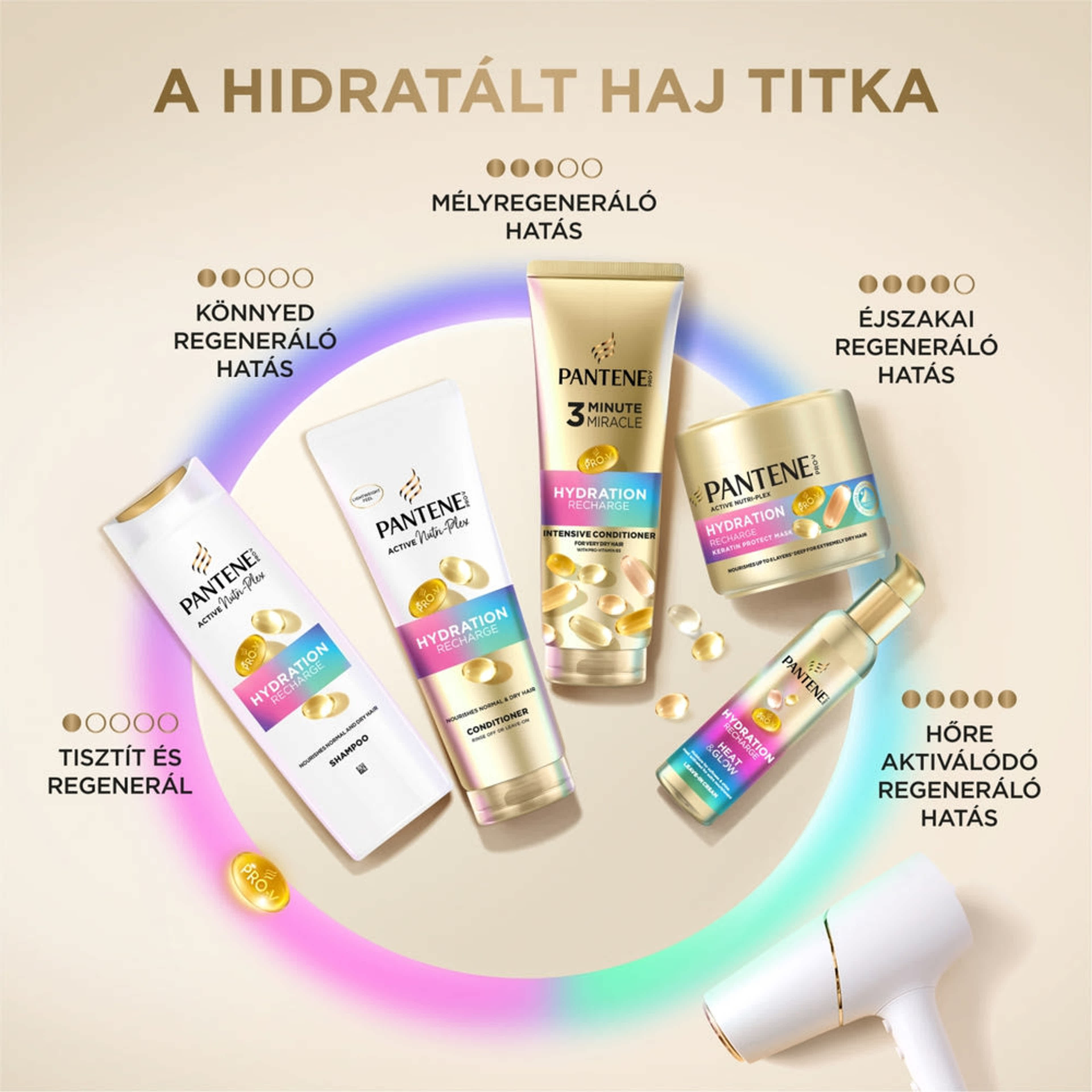 Fedezze fel a Pantene Hydration Recharge 3 Minute Miracle intenzív balzsamot, a rendkívül száraz haj táplálásának és védelmének hatékony forrását. A B5-Pro-Vitamint, E-vitamint, erősítő lipideket és védő antioxidánsokat tartalmazó formula hidratáló összetevőkkel a hajszálakba hatolva azonnal mélyen táplálja a tincseket. Már egyetlen használattal puhává és fényessé varázsolja a száraz hajat. Négyféleképpen használható: alkalmazza a Hydration Recharge termékcsalád többi termékével együtt az átfogó és tápláló hajápolás érdekében.