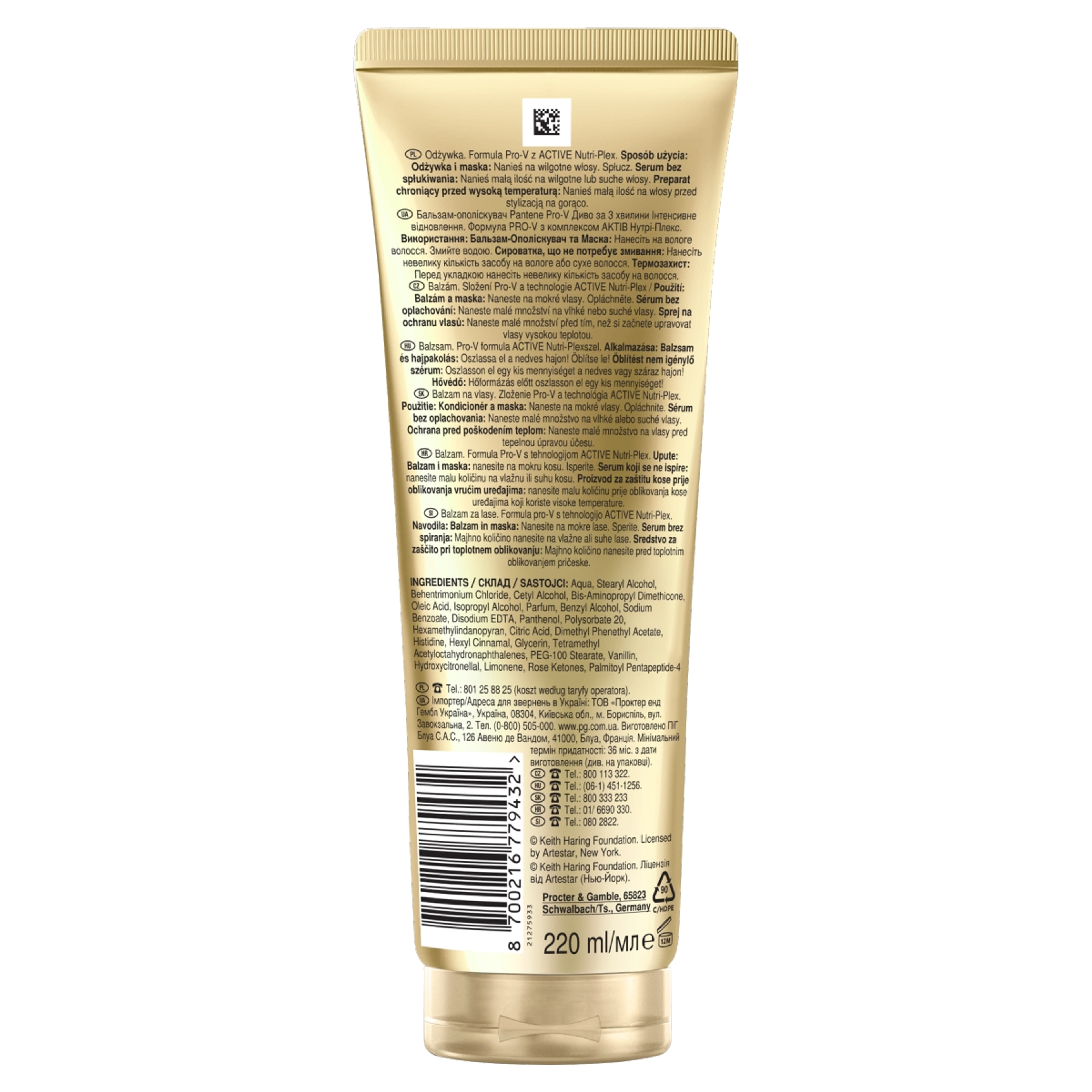Aqua, Stearyl Alcohol, Behentrimonium Chloride, Cetyl Alcohol, Bis-Aminopropyl Dimethicone, Oleic Acid, Isopropyl Alcohol, Parfum, Benzyl Alcohol, Sodium Benzoate, Disodium EDTA, Panthenol, Polysorbate 20, Hexamethylindanopyran, Citric Acid, Dimethyl Phenethyl Acetate, Histidine, Hexyl Cinnamal, Glycerin, Tetramethyl Acetyloctahydronaphthalenes, PEG-100 Stearate, Vanillin, Hydroxycitronellal, Limonene, Rose Ketones, Palmitoyl Pentapeptide-4