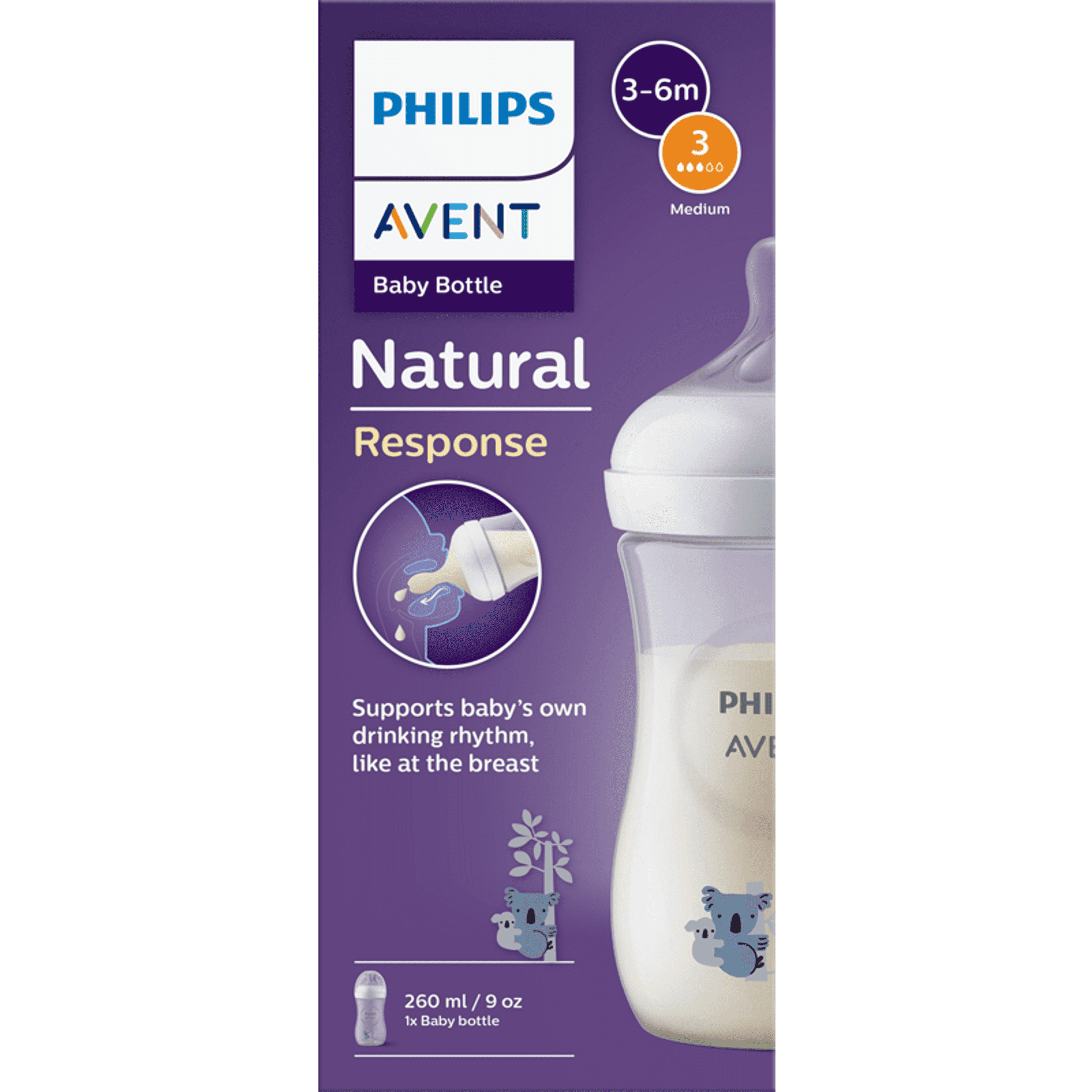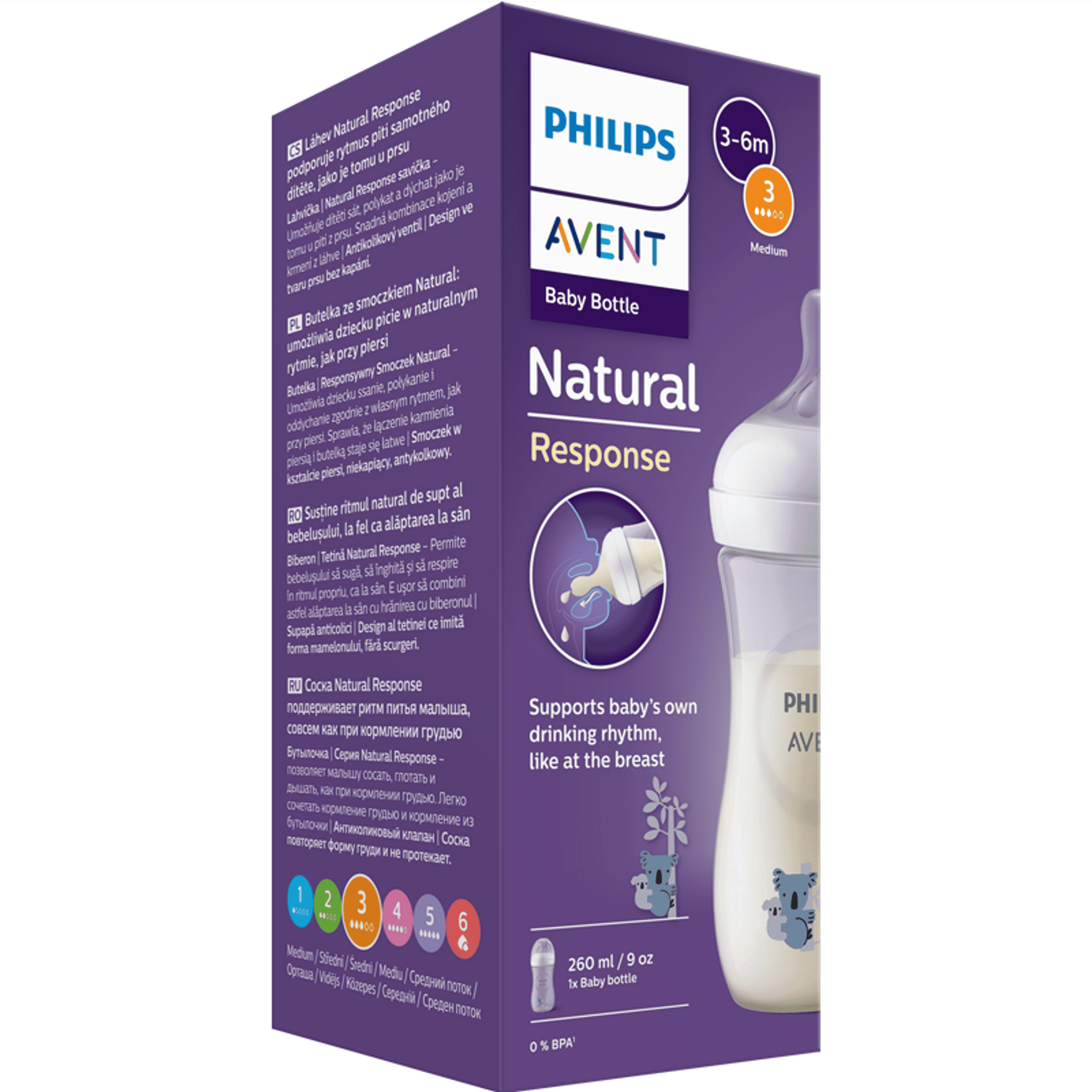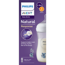A Philips Avent Natural Response SCY903/67 cumisüveg csak akkor engedi ki a tejet, amikor a gyermek éppen aktívan iszik. A babák a természetes ritmusuk szerint ihatnak, nyelhetnek és vehetnek levegőt, ahogyan az anyamellen tennék. Csepegésmentes cumifejjel, BPA-mentes anyagokból készítve.