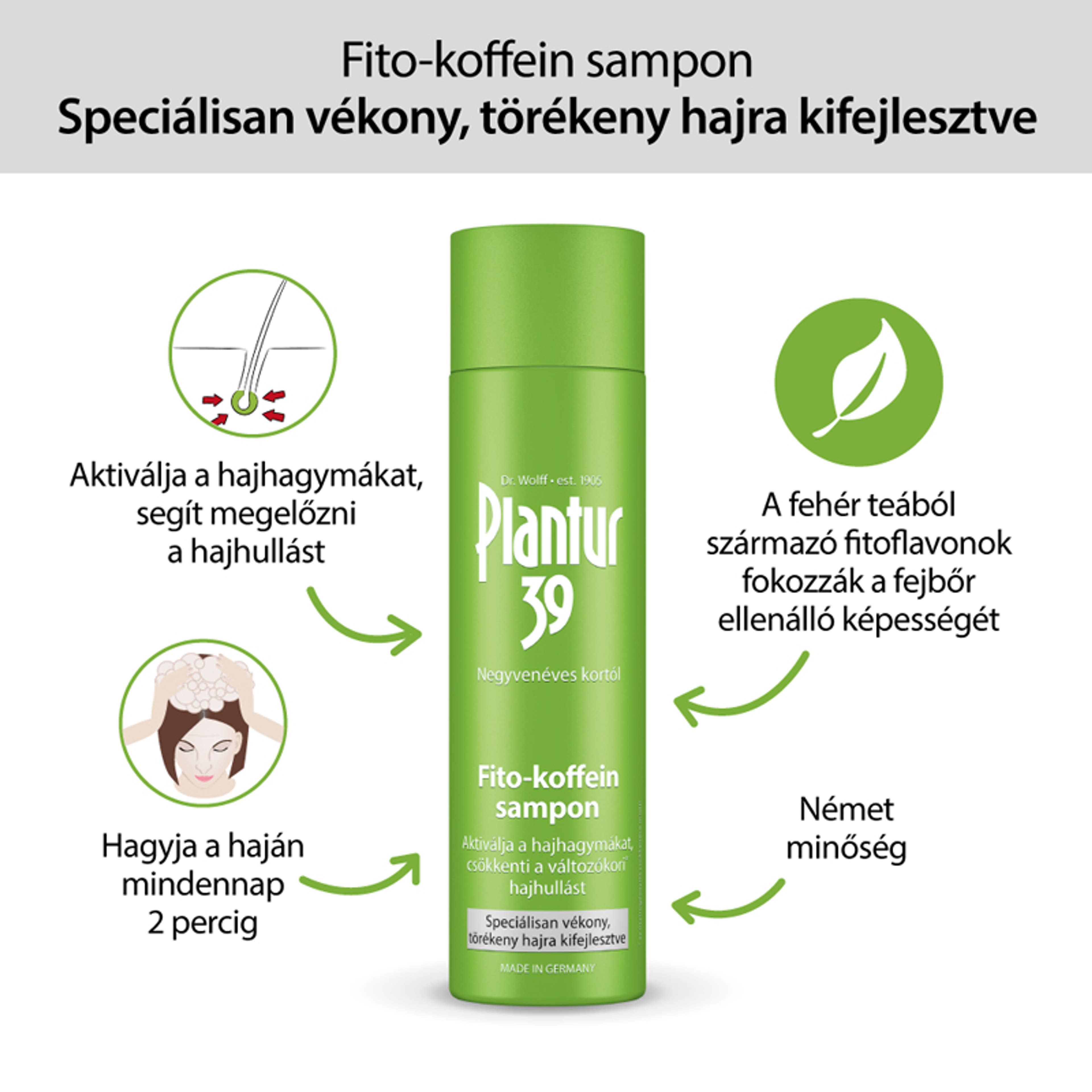A nők hajhagymáit a változókor elérkeztéig a női hormonok (ösztrogén) magas szintje védi. Ezt követően a női hormonok szintje csökkenni kezd, míg a férfi hormonok hatása fokozódik. A következmény: ez hajhulláshoz* vezethet. A samponban található aktív összetevő, a koffein, már a hajmosás során (120 másodperc hatásidő után bizonyíthatóan) eljut a hajhagymákig.