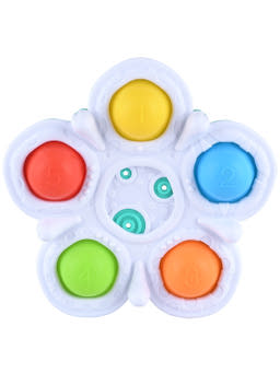 A kisvirág szirmain különböző színű nyomkodható gumik vannak, melyek egyik oldalán számok, a másik oldalán pedig különböző formák keltik fel a kicsik érdeklődését. A játékon lévő kis talpak segítenek, hogy necsak kézbe fogva, de egy sík felületre helyezve is kényelmesen nyomkodni lehessen a kis gumiszirmokat.