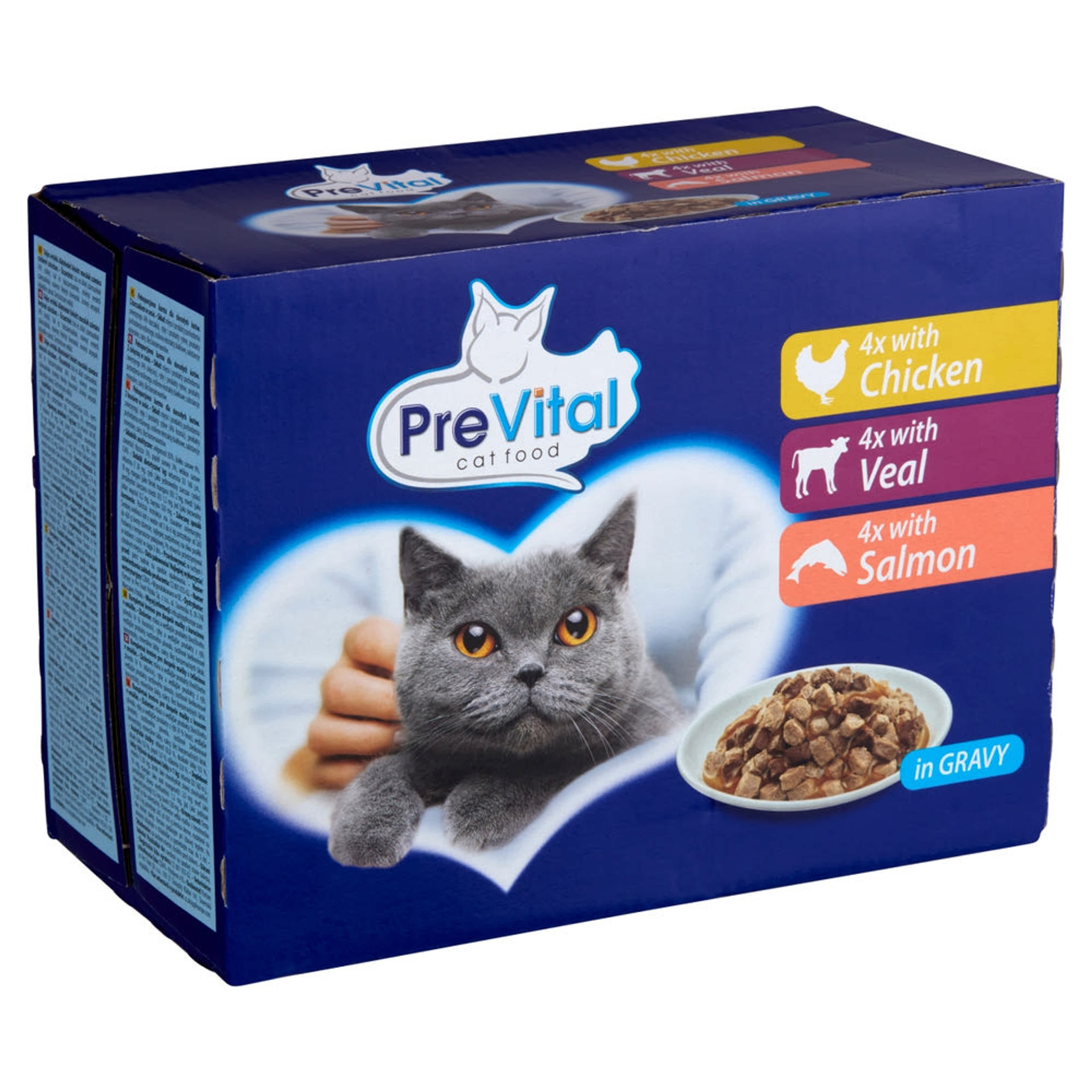 PreVital nedves macskaeledel felnőtt macskáknak szószban csirkével, borjúval és lazaccal alutasakos macskatáp (12x100g) - 1200 g