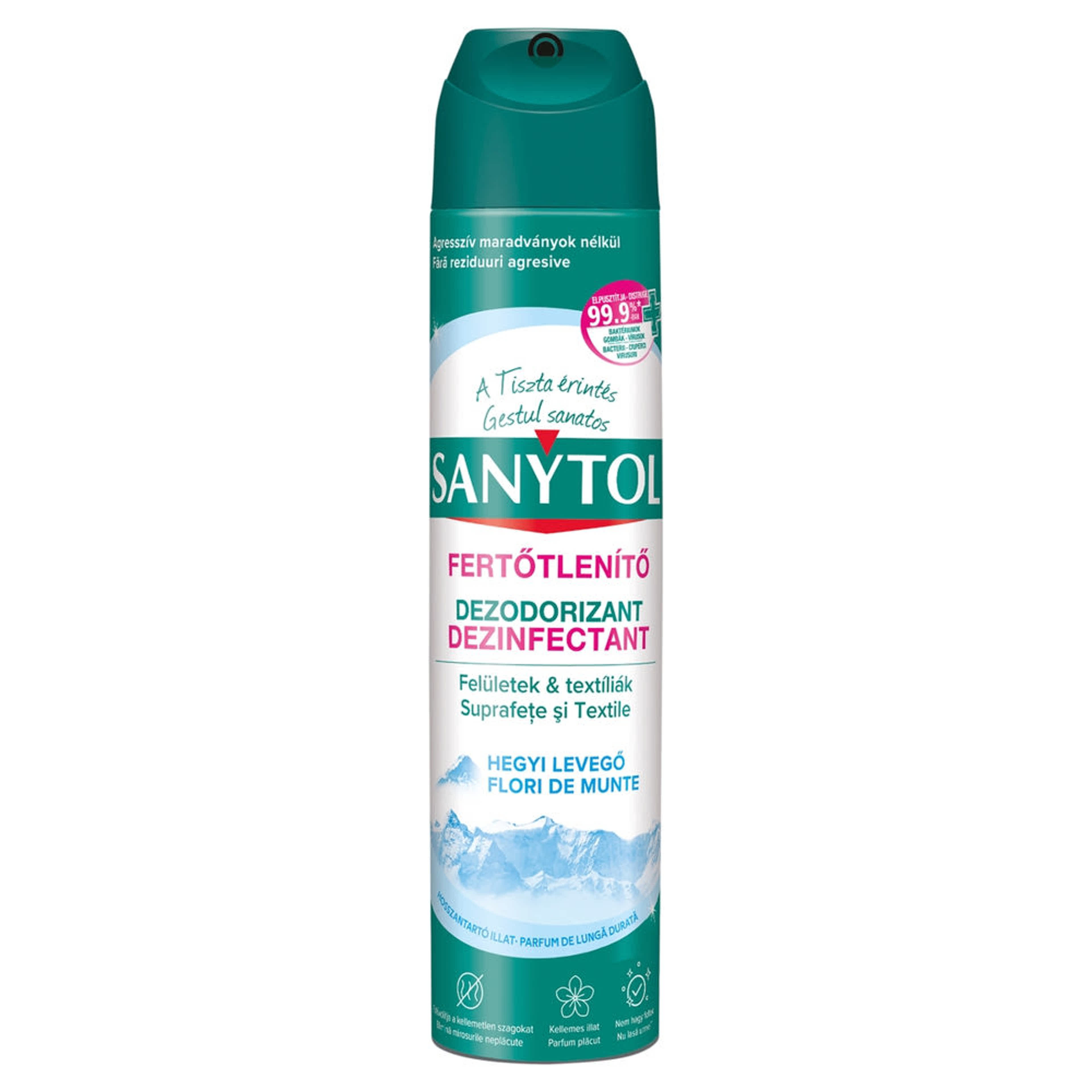 A Sanytol, a klórmentes fertőtlenítés szakértője kifejlesztette fertőtlenítő légfrissítő aeroszolját, mely biztosítja Önnek a tökéletes higiéniát és kellemes illatot varázsol környezetébe. Egyedülálló formulája semlegesíti a rossz szagok forrását, és elpusztítja a felületeken és textíliákon található baktériumok, gombák és vírusok 99,9%-át.