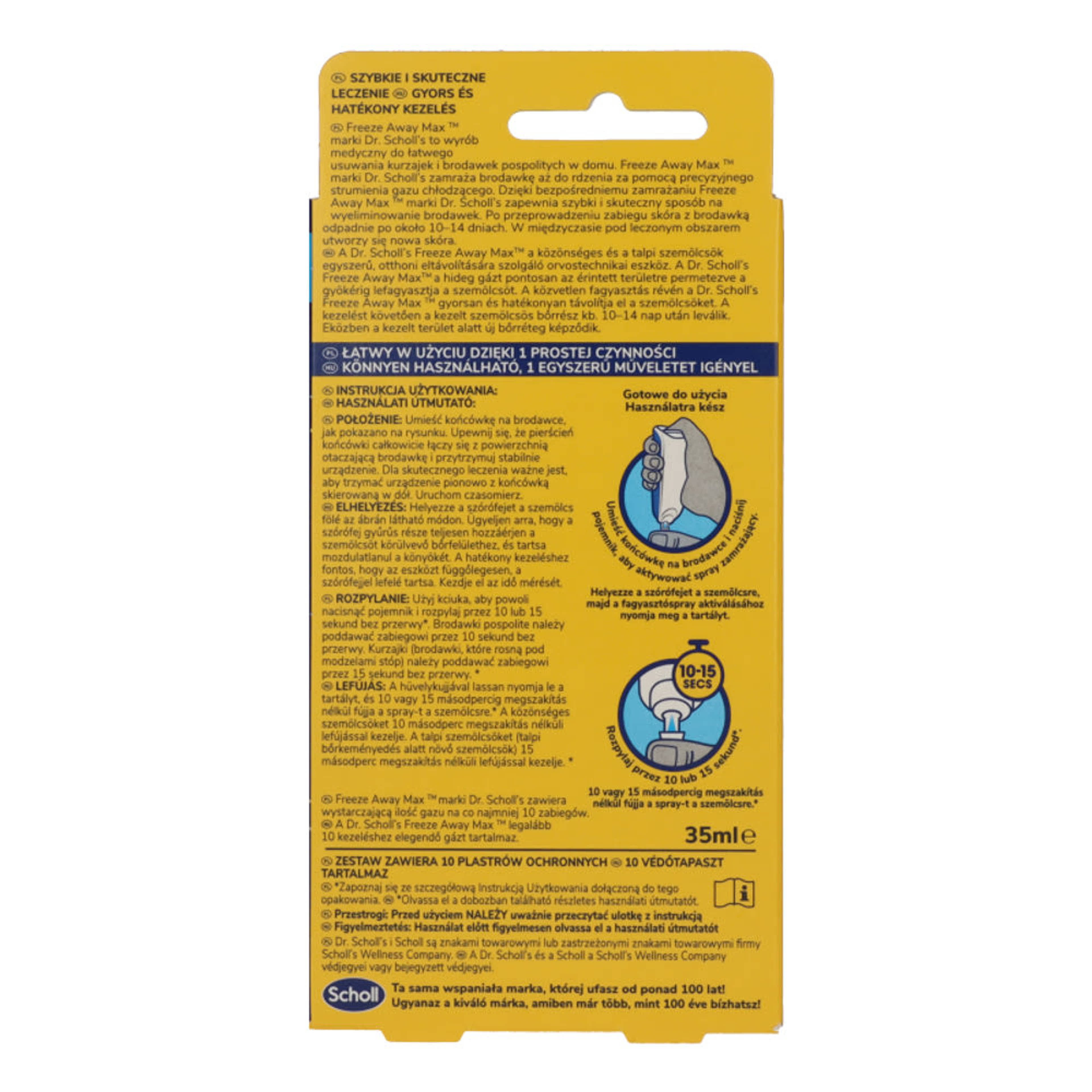 A Dr. Scholl's Freeze Away Max ™ közönséges és talpi szemölcsök kezelése javallott. A Dr. Scholl's Freeze Away Max™-ot 18 éves és idősebb személyek alkalmazhatják. Ne alkalmazza 4 évesnél fiatalabb gyermekeken.
