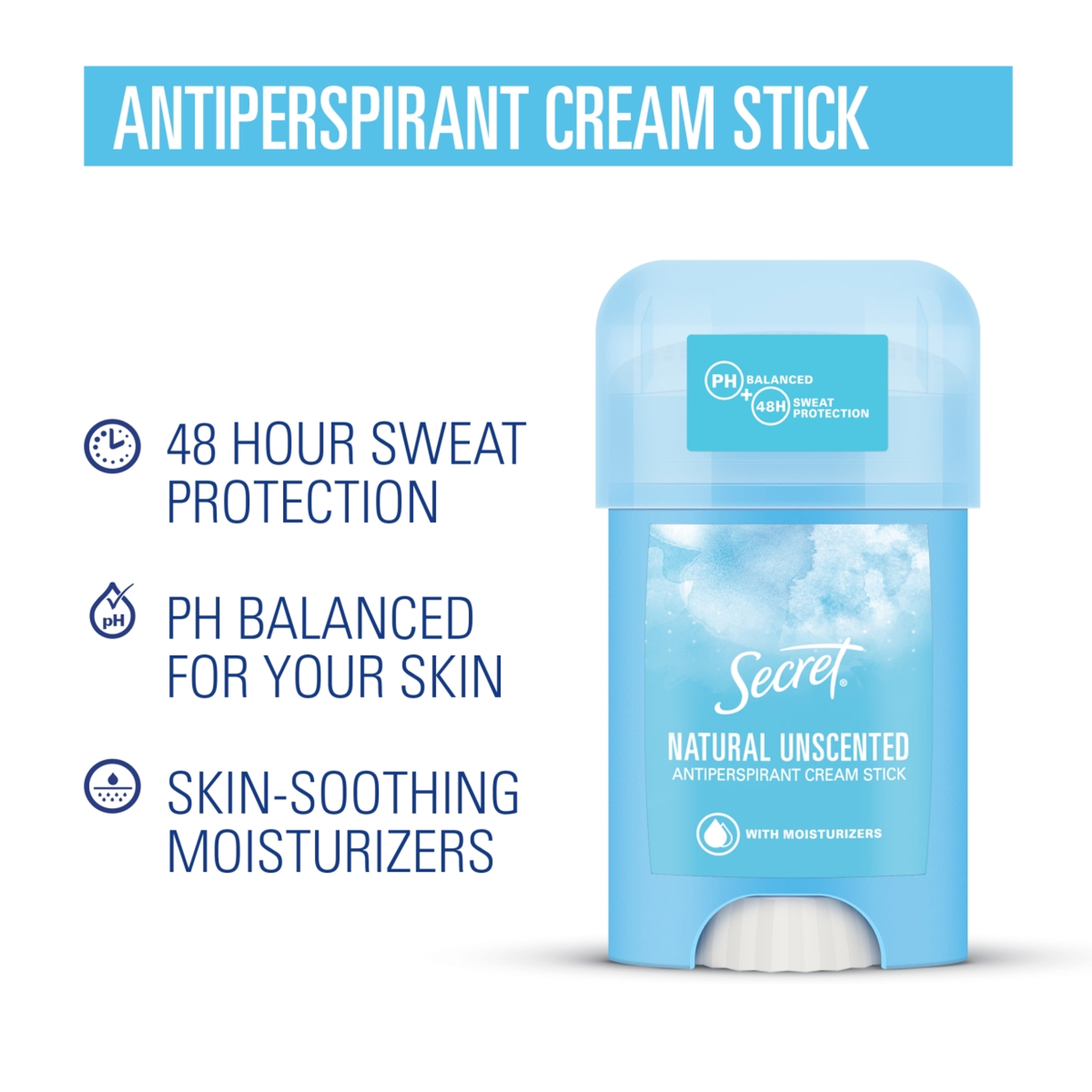 A pH-semleges, valamint hidratáló hatóanyagokat tartalmazó Secret Natural Illatmentes izzadásgátló krémstift segít megőrizni bőröd simaságát és frissességét akár 48 órán át