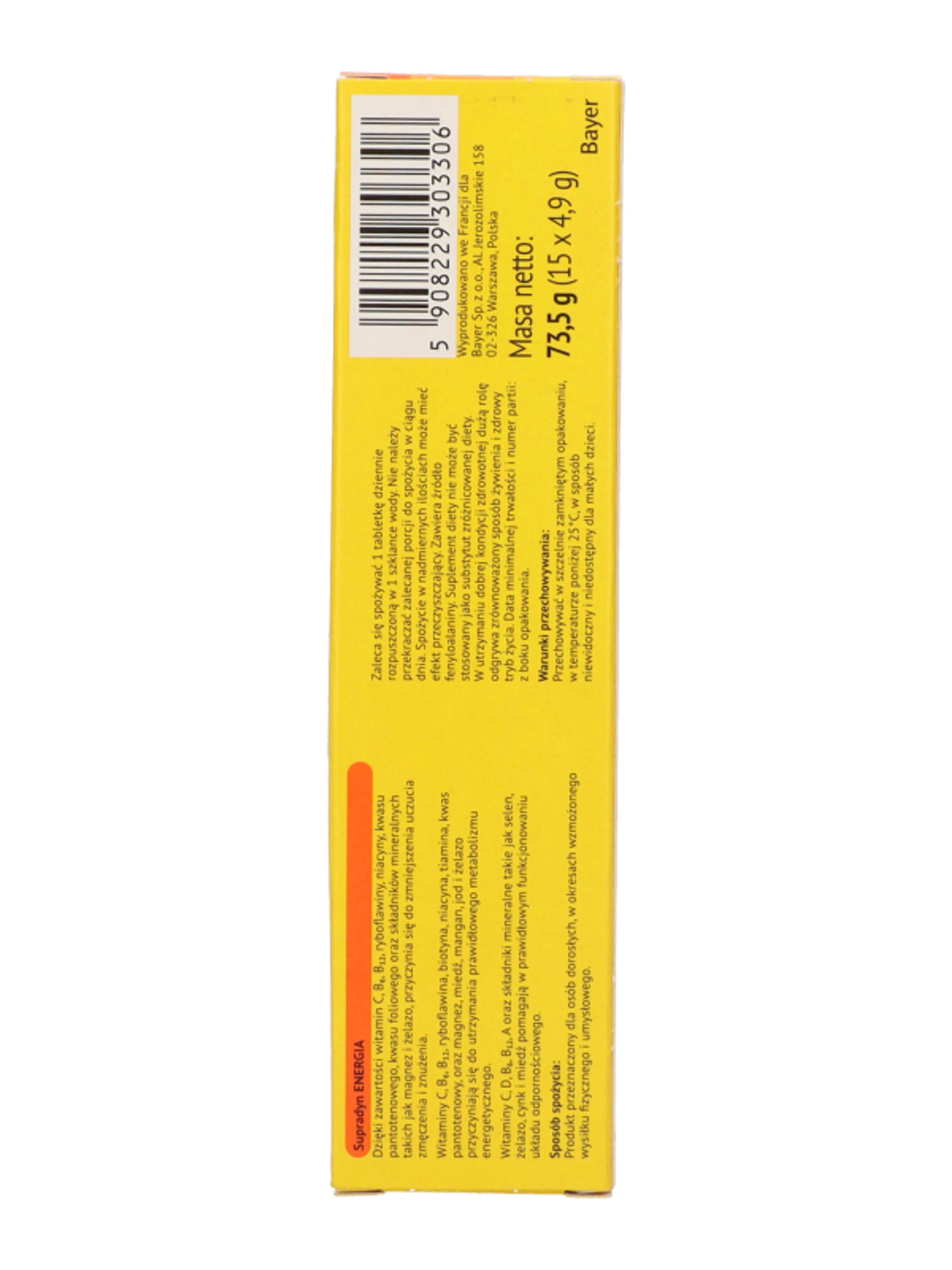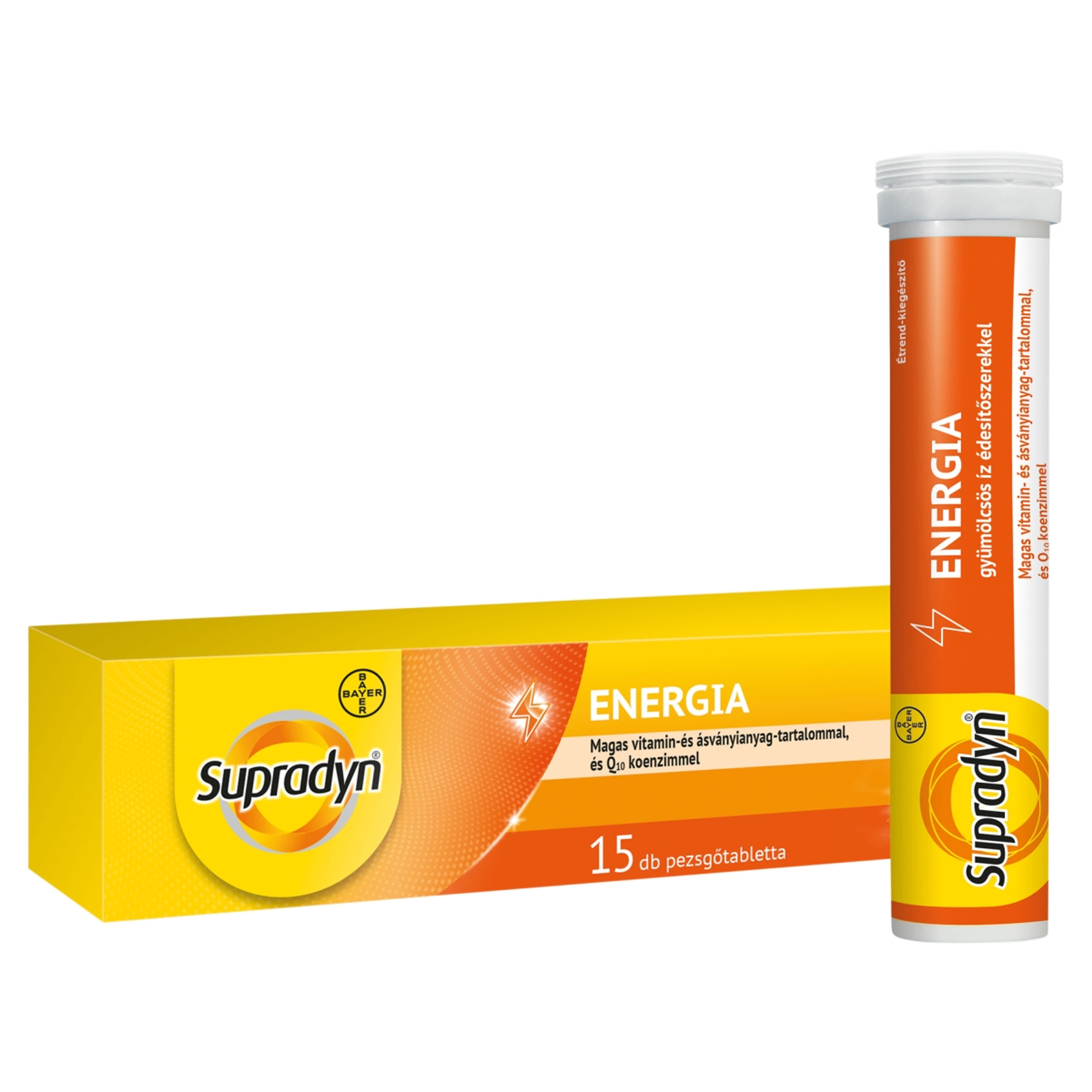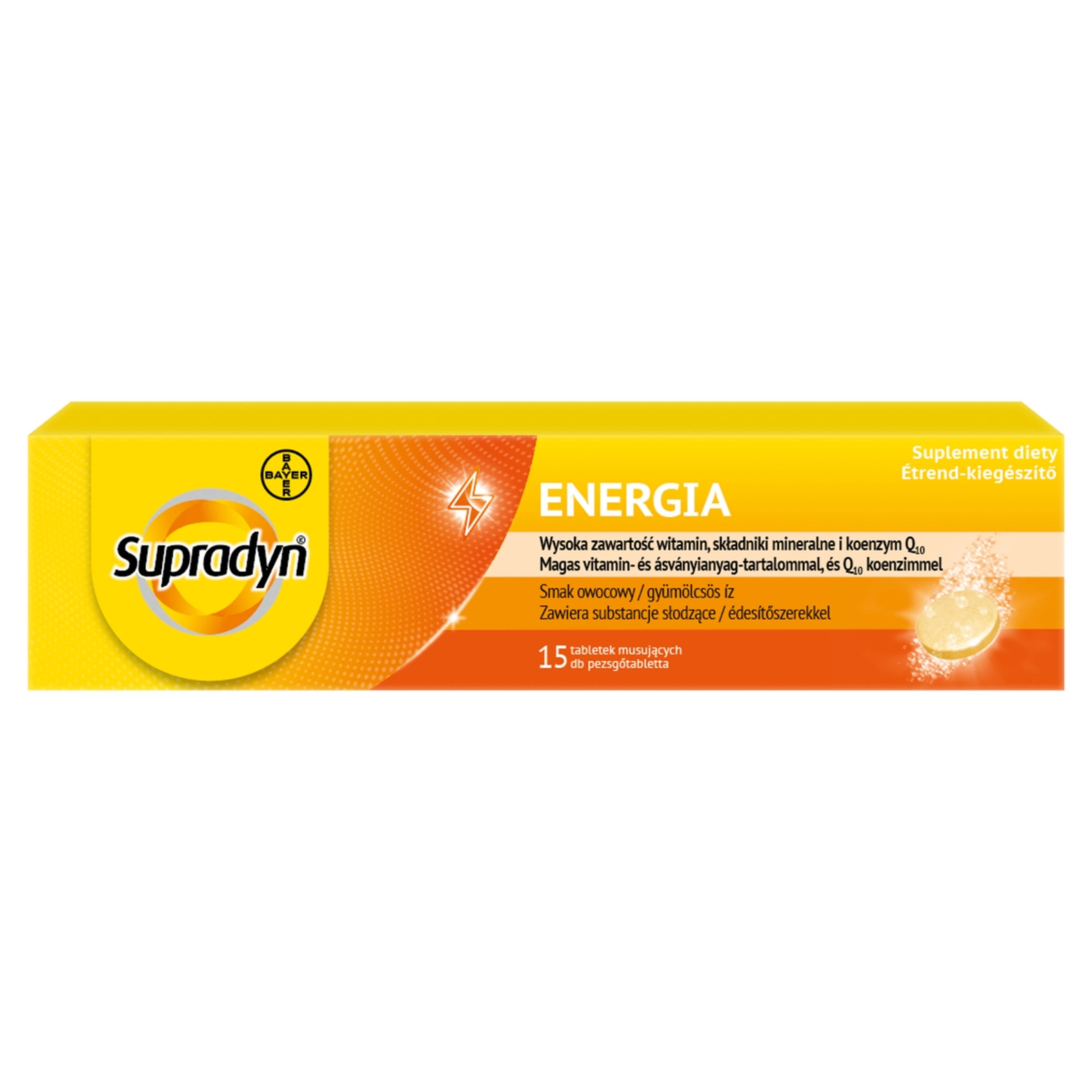 Étkezési sav (citromsav), Savanyúságot szabályozó anyag (nátrium-karbonátok), Tömegnövelő szerek (szorbit, izomalt), Kalcium-karbonát, Magnézium-szulfát, L-aszkorbinsav, Magnézium-karbonát, Színezék (béta-karotin), Narancs aroma, Vas(III)-pirofoszfát, Koenzim-Q₁₀ 0,1%, Nikotinamid, Csomósodást gátló szer (polivilnilpolipirrolidon), D-α-tokoferilacetát, Retinil-palmitát, Cink-citrát, Nátrium-klorid, Marakuja aroma, Édesítőszerek (aszpartám, aceszulfám-k), Habzásgátló keverék [hordozó (mannit), habzásgátlók (zsírsavak szacharóz-észterei, poliszorbát 80, dimetilpolisziloxán, szilícium-dioxid)], Kalcium-D-pantotenát, Színezék (céklapor), Nátrium-szelenit, Riboflavin-5'-foszfát nátriumsója, Mangán-szulfát, Nátrium-molibdát, Tiamin-hidroklorid, Ciano-kobalamin, Kálium-jodid, Réz(II)-citrát, Piridoxin-hidroklorid, Kolekalciferol, Fillokinon, Pteroil-monoglutaminsav, D-biotin