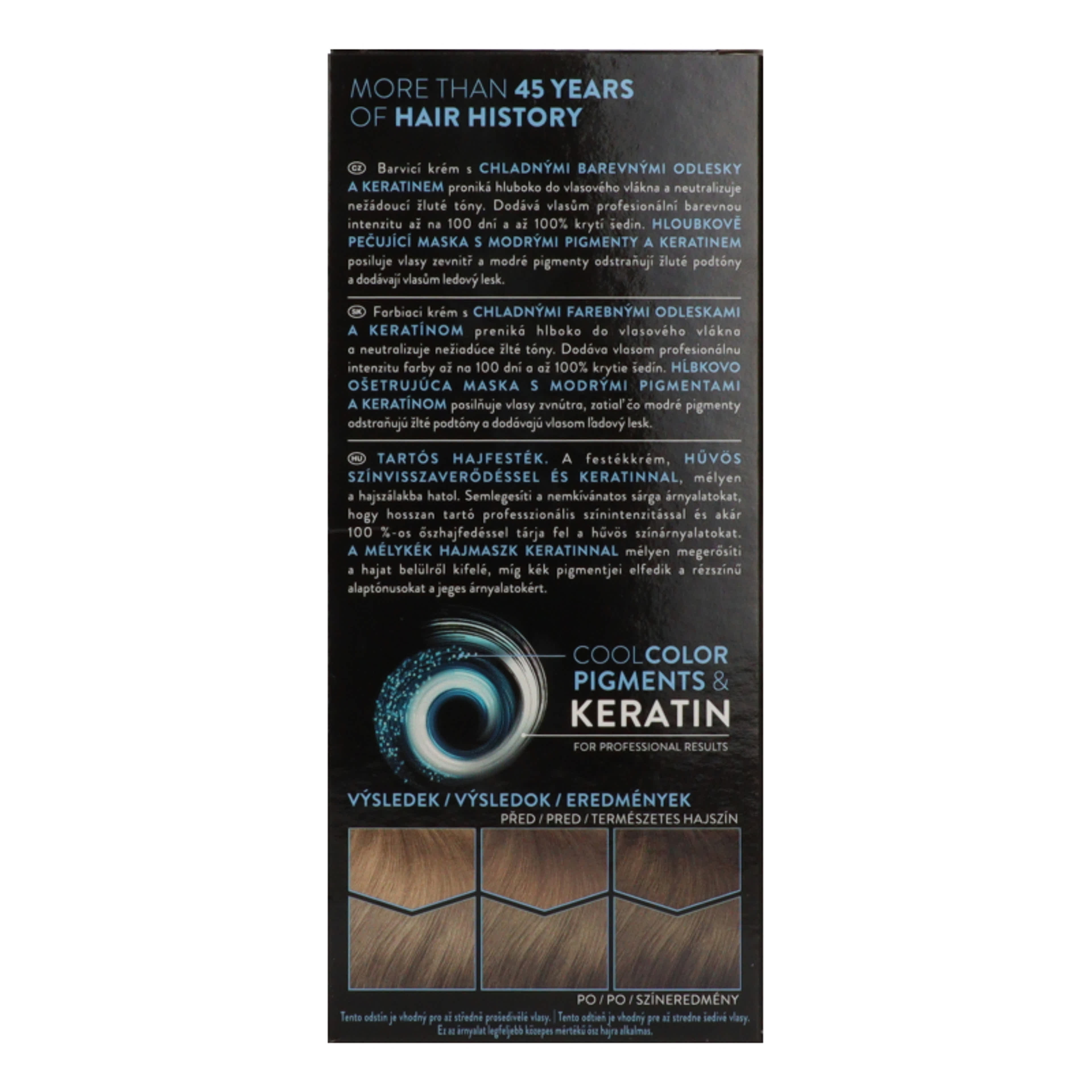 A festékkrém, hűvös színvisszaverődéssel és keratinnal, mélyen a hajszálakba hatol. Semlegesíti a nemkívánatos sárga árnyalatokat, hogy hosszan tartó professzionális színintenzitással és akár 100 %-os őszhajfedéssel tárja fel a hűvös színárnyalatokat. A Mélykék Hajmaszk Keratinnal mélyen megerősíti a hajat belülről kifelé, míg kék pigmentjei elfedik a rézszínű alaptónusokat a jeges árnyalatokért.