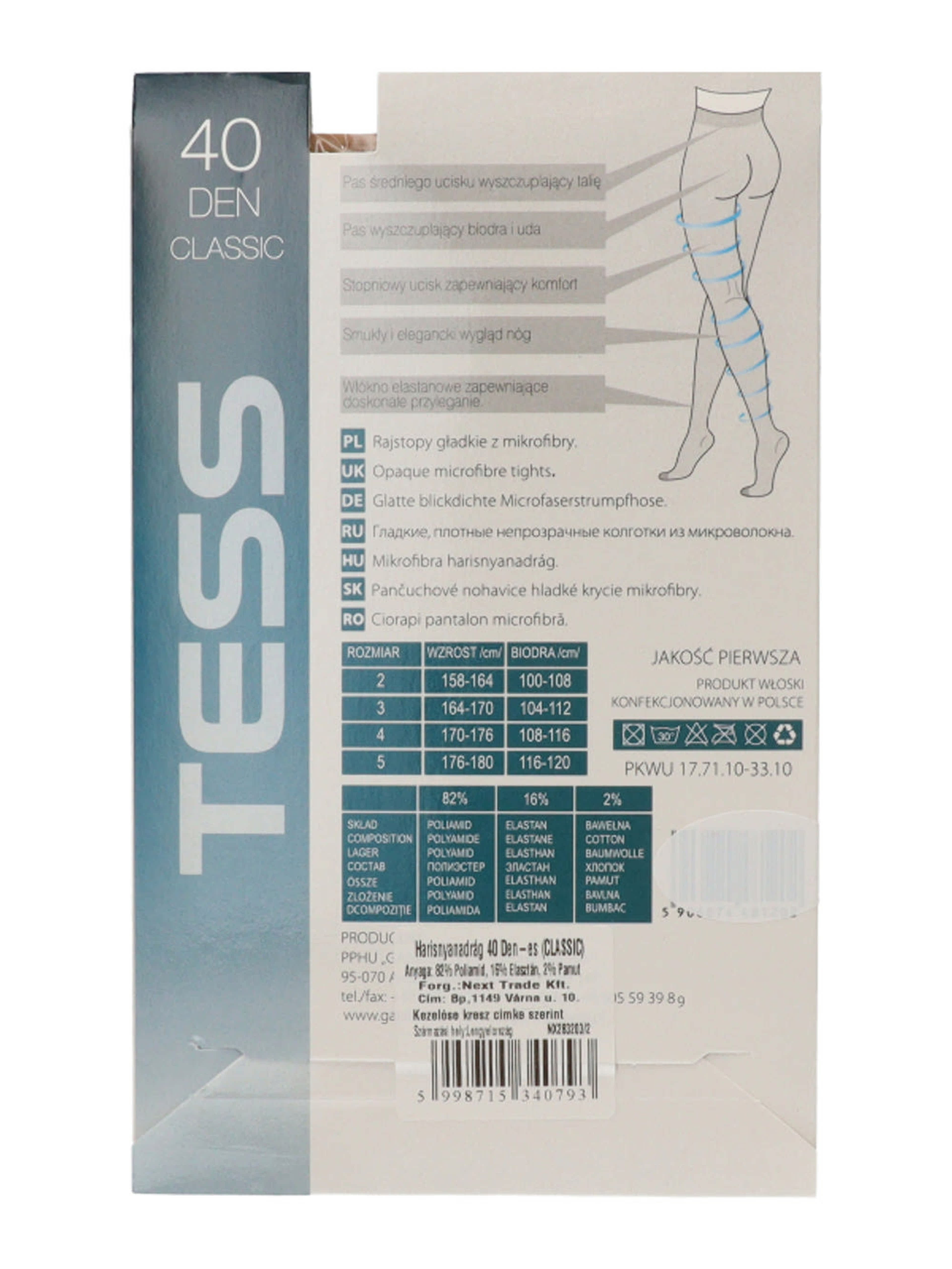 A TESS 40 DEN CLASSIC harisnyanadrág ideális választás a mindennapi eleganciához. Kiváló minőségű mikroszálas anyagból készült, amely puha tapintású, mégis tartós viseletet biztosít. A 40 denes vastagság természetes fedést ad a lábaknak, miközben megőrzi azok nőies megjelenését.