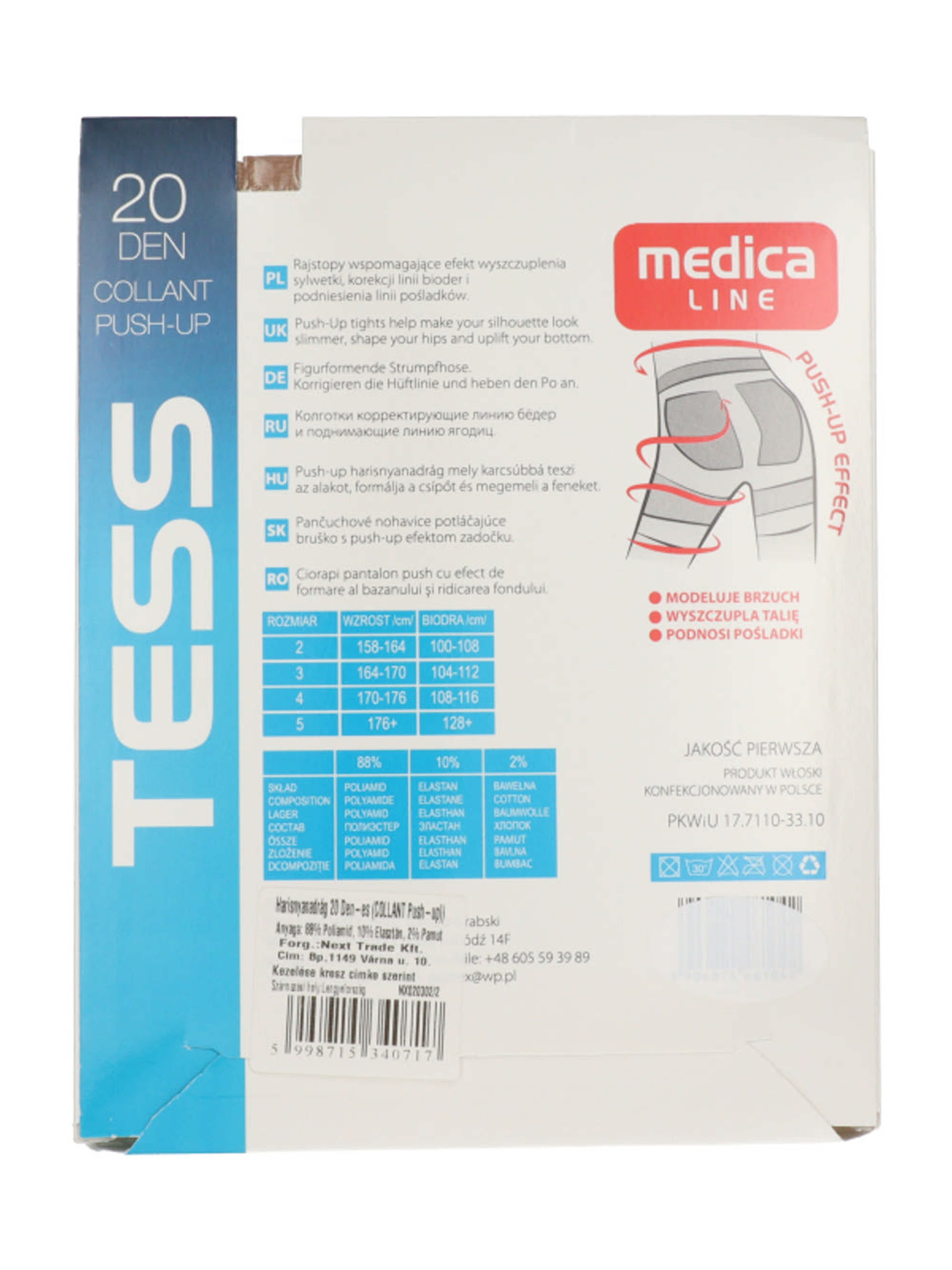 Harisnyanadrág 20 Den-es (COLLANT Push-up)A Medica Line Tess push-up harisnyanadrág kifejezetten alakformáló kialakítással készült, hogy kiemelje a nőies vonalakat, miközben elegáns és természetes megjelenést biztosít.