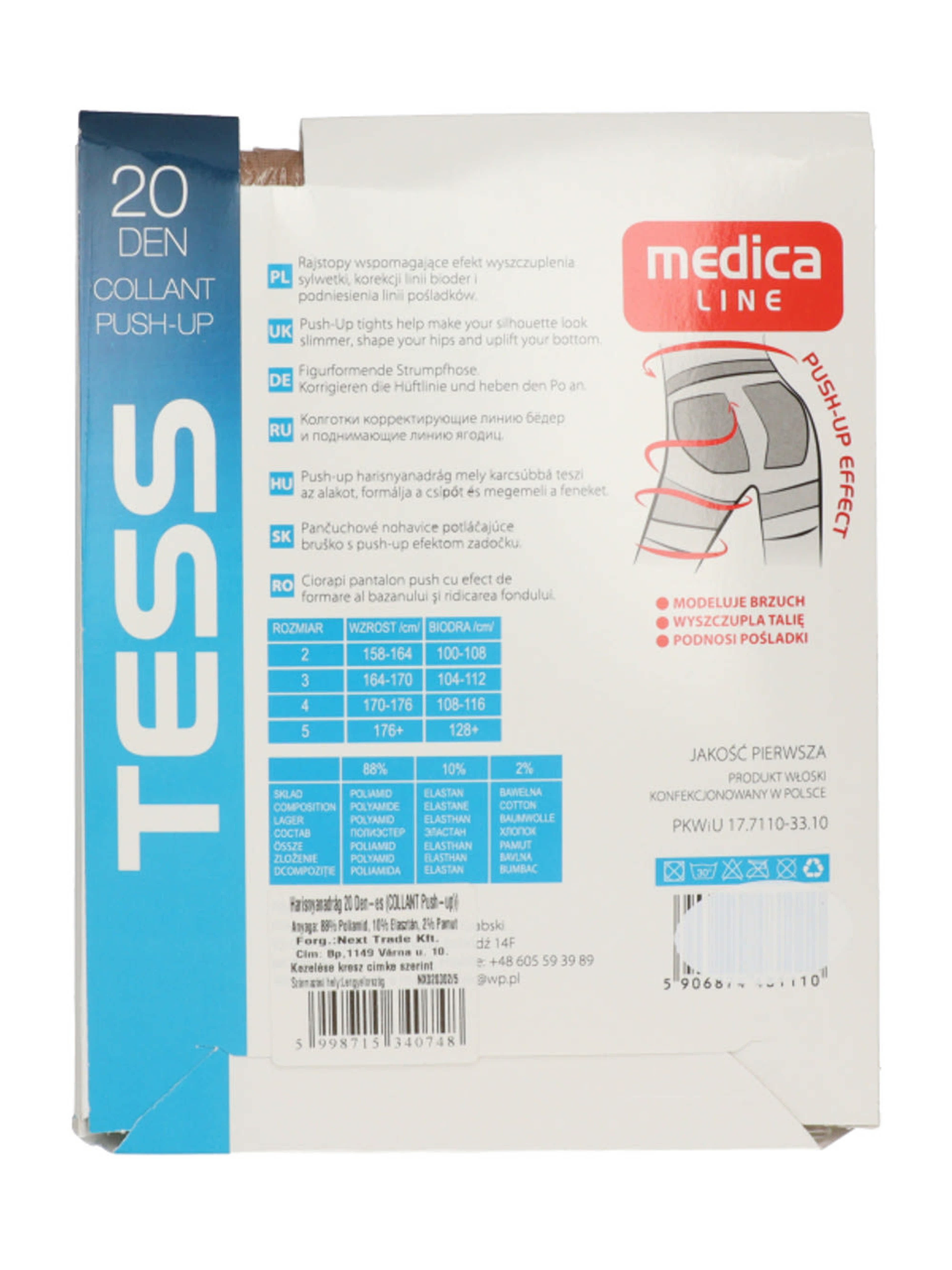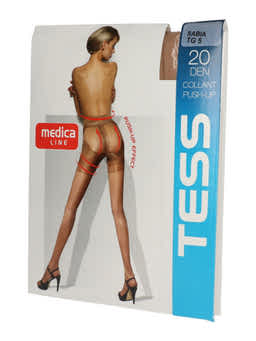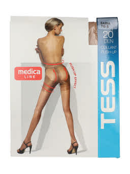 A Tess Collant Push-Up harisnyanadrág ipari körülmények között, rugalmas poliamid–elasztán szálakból készül. A speciális kötési technológia biztosítja a push-up és alakformáló részeket (has-, derék- és farformálás), valamint az egyenletes, 20 DEN finomságú anyagszerkezetet.