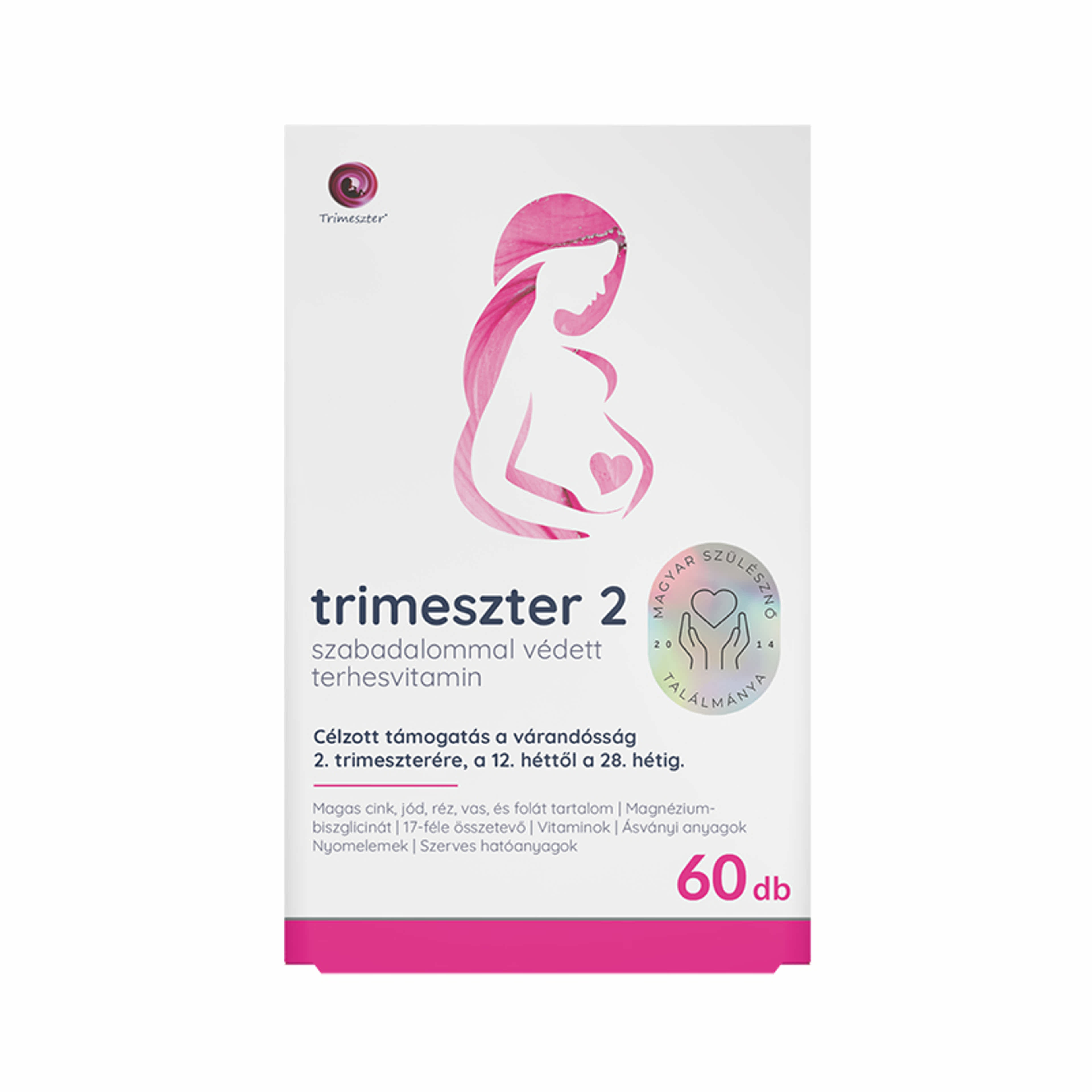 Célzott támogatás a várandósság 2. trimeszterére, a 12. héttől a 28. hétig. Magas cink, jód, réz, vas, és folát tartalom, Magnézium-biszglicinát, 17-féle összetevő, Vitaminok, Ásványi anyagok, Nyomelemek, Szerves hatóanyagok A TRIMESZTER 2 Terhesvitamin étrend-kiegészítő tabletta, szakértő által összeállított hatóanyagtartalmú többféle vitamint, ásványi anyagot és nyomelemet tartalmazó készítmény, célzottan a 2. trimeszterre, a várandósság 12. hetétől a 28. hetéig.