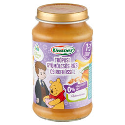 Víz, Mangóvelő* (15%), Almavelő* (15%), Banánvelő* (10%), Csirkehús (8%), Rizs* (3,5%), Kukoricakeményítő, Finomított napraforgó-étolaj*, Antioxidáns: aszkorbinsav, *Ellenőrzött bio termelésből, A bio összetevők aránya 81%