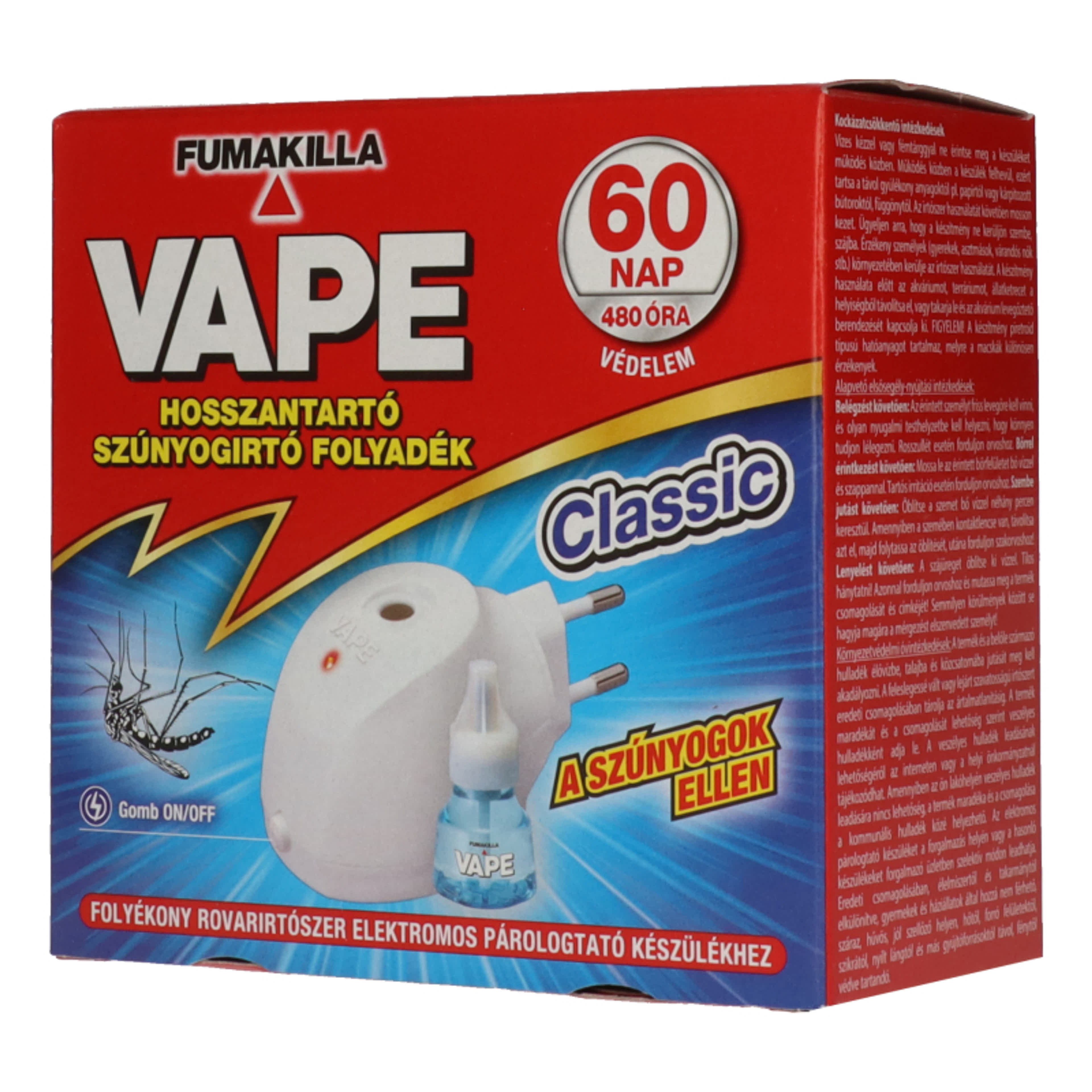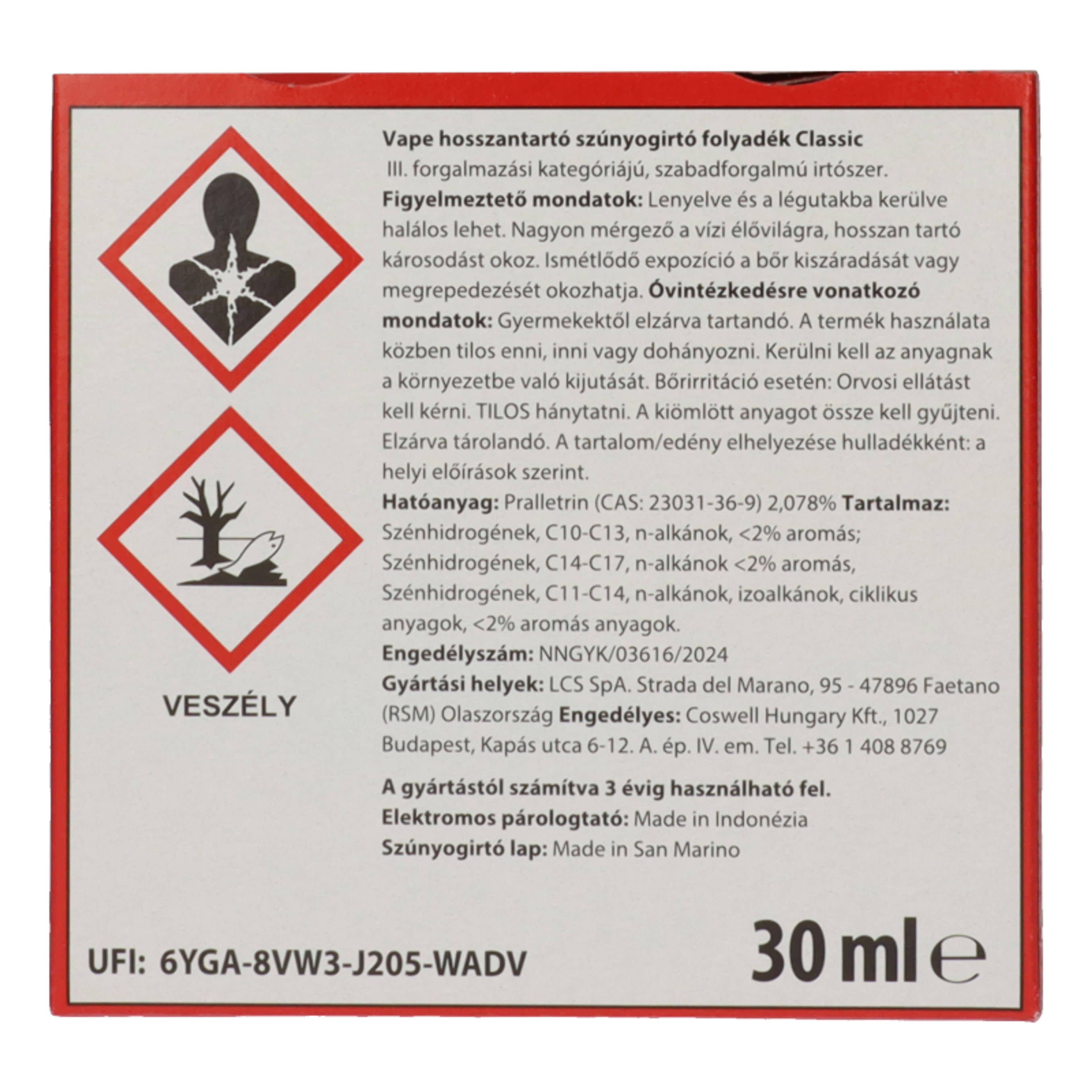 III. forgalmazási kategóriájú, szabadforgalmú irtószer. Figyelmezteto mondatok: Lenyelve és a légutakba kerülve halálos lehet. Nagyon mérgezo a vízi élovilágra, hosszan tartó károsodást okoz. Ismétlodo expozíció a bor kiszáradását vagy megrepedezését okozhatja. Óvintézkedésre vonatkozó mondatok: Gyermekektol elzárva tartandó. A termék használata közben tilos enni, inni vagy dohányozni. Kerülni kell az anyagnak a környezetbe való kijutását. Borirritáció esetén: Orvosi ellátást kell kérni. TILOS hánytatni. A kiömlött anyagot össze kell gyujteni. Elzárva tárolandó. A tartalom/edény elhelyezése hulladékként: a helyi eloírások szerint. Hatóanyag: Pralletrin (CAS: 23031-36-9) 2,078% Tartalmaz: Szénhidrogének, C10-C13, n-alkánok, <2% aromás; Szénhidrogének, C14-C17, n-alkánok <2% aromás, Szénhidrogének, C11-C14, n-alkánok, izoalkánok, ciklikus anyagok, <2% aromás anyagok. Engedélyszám: NNGYK/03616/2024 Gyártási helyek: LCS SpA. Strada del Marano, 95 - 47896 Faetano (RSM) Olaszország Engedélyes: Coswell Hungary Kft., 1027 Budapest, Kapás utca 6-12. A. ép. IV. em. Tel. +36 1 408 8769 A gyártástól számítva 3 évig használható fel. Elektromos párologtató: Made in Indonézia Szúnyogirtó lap: Made in San Marino UFI: 6YGA-8VW3-J205-WADV Vape hosszantartó szúnyogirtó folyadék Classic Terméktípus: PT18 - Rovarölo és atkaölo szerek, valamint más ízeltlábúak elleni védekezésre használt szerek. Az engedélyezett felhasználás pontos leírása, amennyiben indokolt: Folyékony rovarirtószer elektromos párologtató készülékhez. Célorganizmus(ok) (beleértve a fejlodési szakaszt is): Tudományos név: Culicidae. Közhasználatú név: szúnyogok. Fejlodési szakasz: kifejlett egyedek. Tudományos név: Aedes albopictus. Közhasználatú név: ázsiai tigrisszúnyog. Fejlodési szakasz: kifejlett egyedek. Felhasználási terület: Beltéri. A készülék nedves helyen, szabadban, fürdoszobában nem használható! Az alkalmazás módja(i): Folyékony rovarirtószer elektromos párologtató készülékhez. A párologtató egy kb. 30 m3 térfogatú helyiség szúnyogokkal szembeni védelmét biztosítja. Az irtószer az üzembe helyezése után 2 órával fejti ki a megfelelo hatást. Felhasználói kör: lakossági. A 30 ml-es csomagolás idotartama: 40 nap, napi 12 óra használat esetén, 60 nap, napi 8 óra használat esetén.