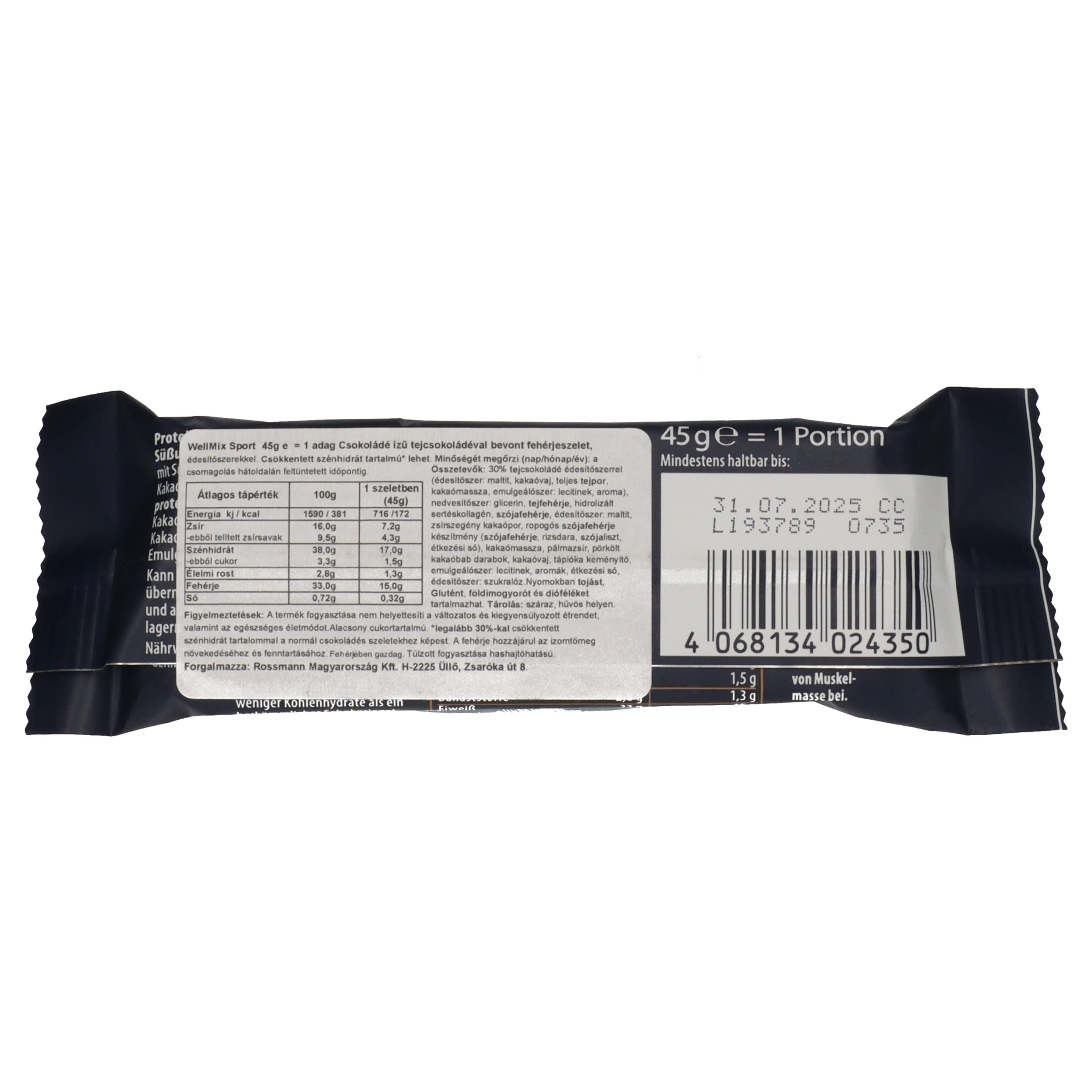 WELL MIX DELUXE SZELET DUPLA CSOKI 45G WellMix Sport Csokoládé ízű tejcsokoládéval bevont fehérjeszelet, édesítőszerekkel Fehérjében gazdag 45g e = 1 adag Csökkentett szénhidrát tartalmú* Alacsony cukortartalmú *legalább 30%-kal csökkentett szénhidrát tartalommal a normál csokoládés szeletekhez képest. A fehérje hozzájárul az izomtömeg növekedéséhez és fenntartásához. Összetevők: 30% tejcsokoládé édesítőszerrel (édesítőszer: maltit, kakaóvaj, teljes tejpor, kakaómassza, emulgeálószer: lecitinek, aroma), nedvesítőszer: glicerin, tejfehérje, hidrolizált sertéskollagén, szójafehérje, édesítőszer: maltit, zsírszegény kakaópor, ropogós szójafehérje készítmény (szójafehérje, rizsdara, szójaliszt, étkezési só), kakaómassza, pálmazsír, pörkölt kakaóbab darabok, kakaóvaj, tápióka keményítő, emulgeálószer: lecitinek, aromák, étkezési só, édesítőszer: szukralóz. Tojást, glutént, földimogyorót és dióféléket tartalmazhat. Figyelmeztetések: A termék fogyasztása nem helyettesíti a változatos és kiegyensúlyozott étrendet, valamint az egészséges életmódot. Túlzott fogyasztása hashajtó hatású lehet. Forgalmazza: Rossmann Magyarország Kft. H-2225 Üllő, Zsaróka út 8.