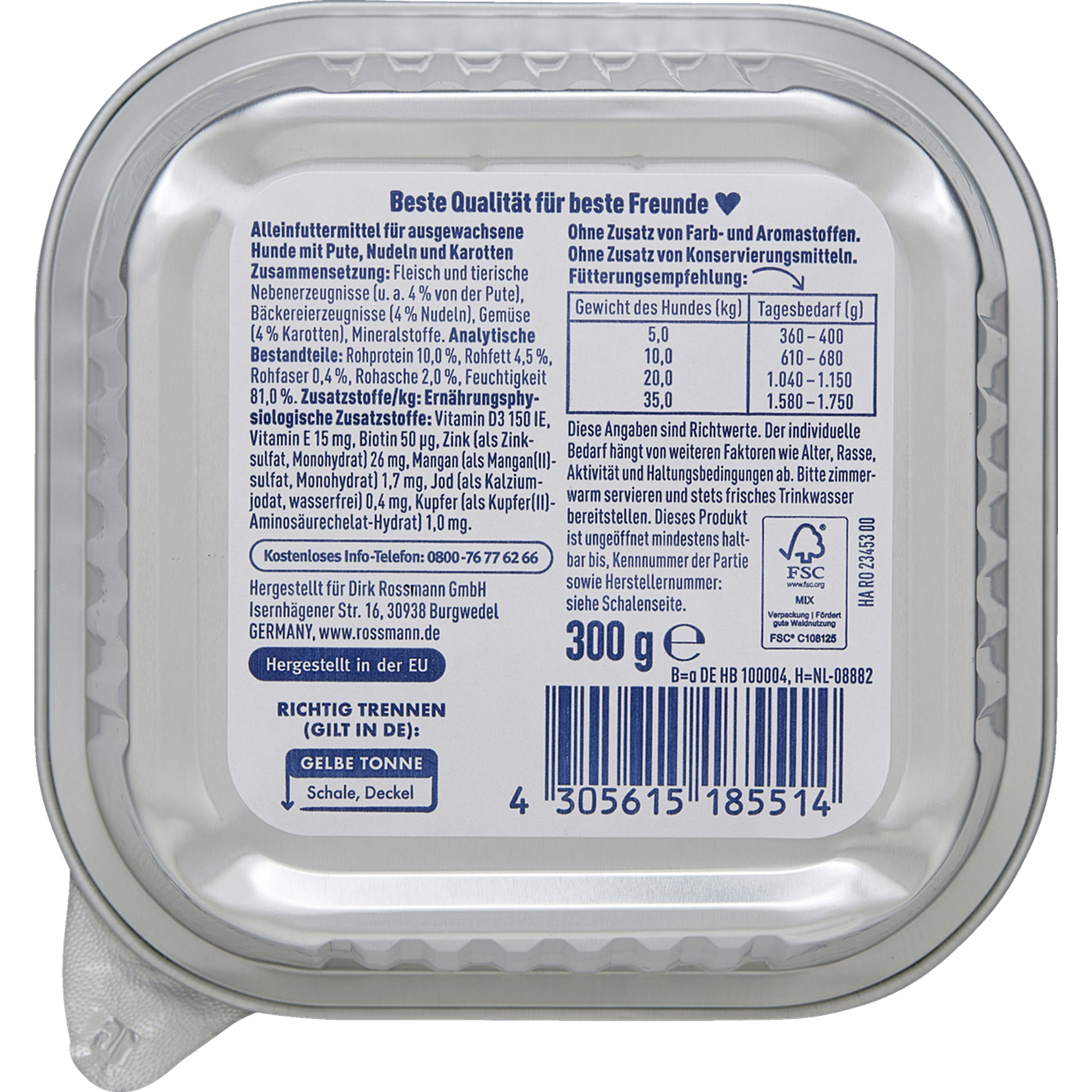 Az adatok iránymutatásként szolgálnak. A tényleges szükséglet függ az életkortól, fajtától és a tartási körülményektől. Kérjük, szobahőmérsékleten kínálja, és mindig biztosítson friss ivóvizet kutyájának.