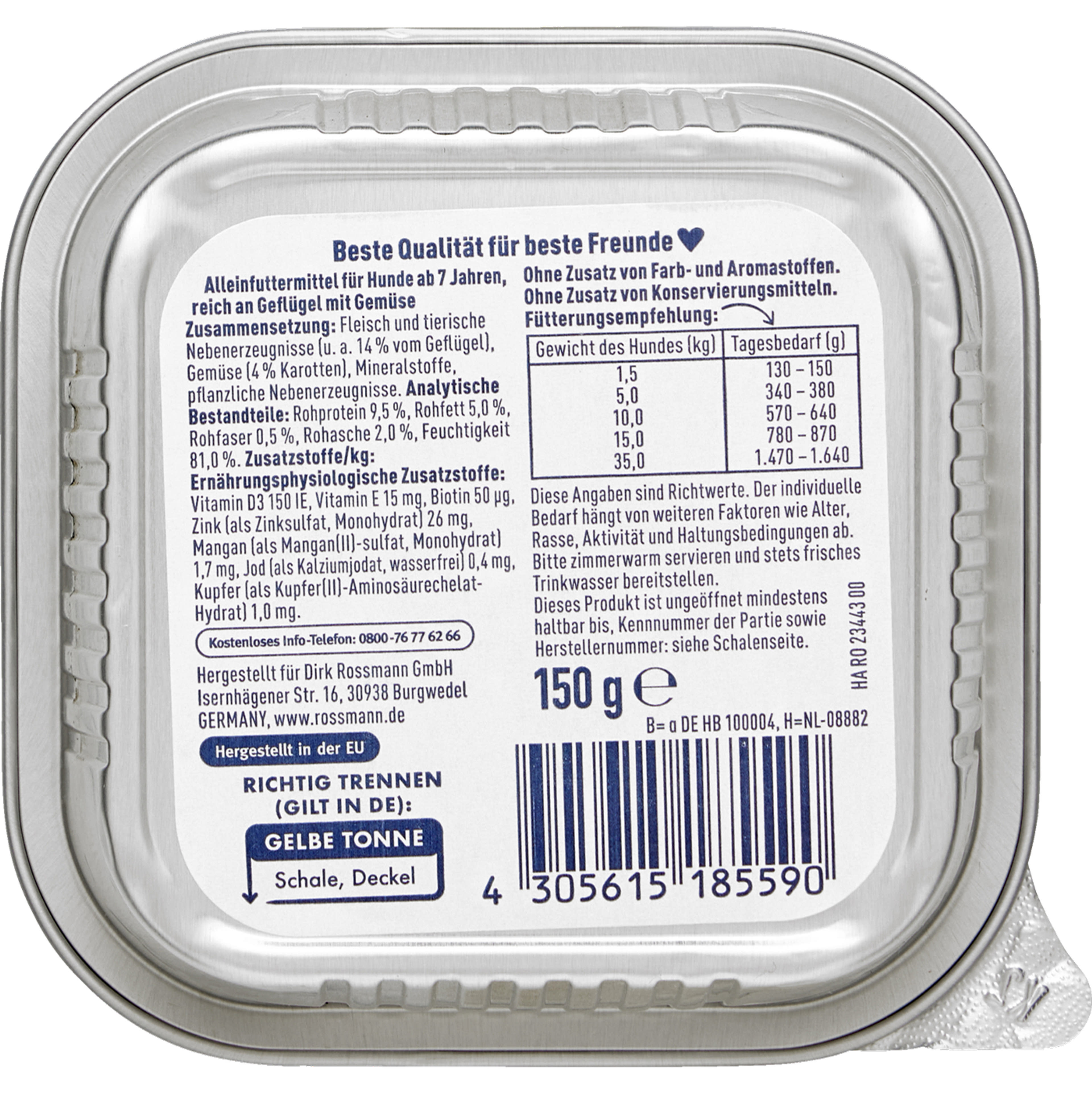 A napi mennyiséget legalább két étkezésre ossza el. Az adatok iránymutató értékek. A tényleges szükséglet függ a kutya életkorától, fajtájától, aktivitásától és tartási körülményeitől. Szobahőmérsékleten tálalja, és mindig biztosítson friss ivóvizet.
