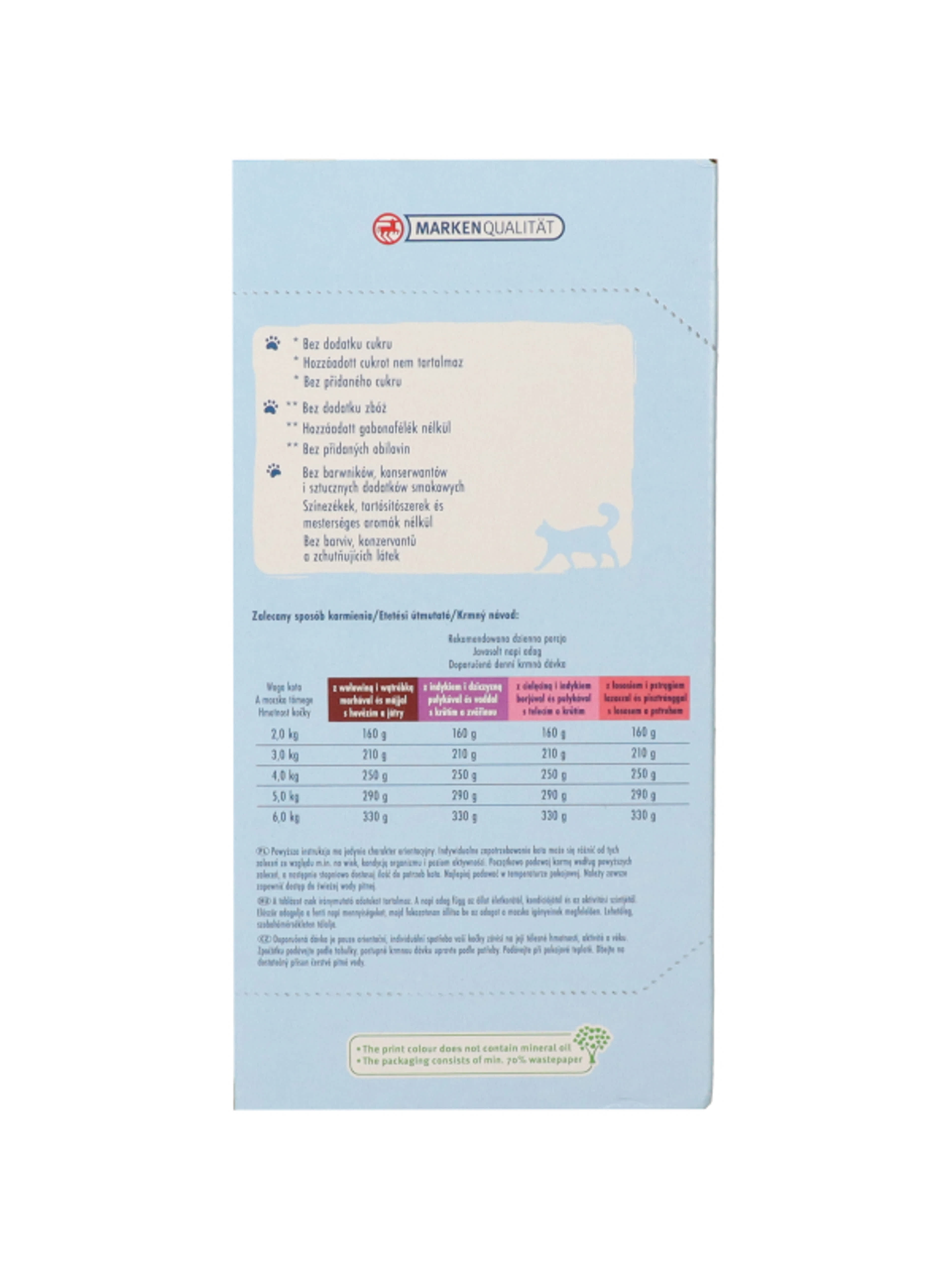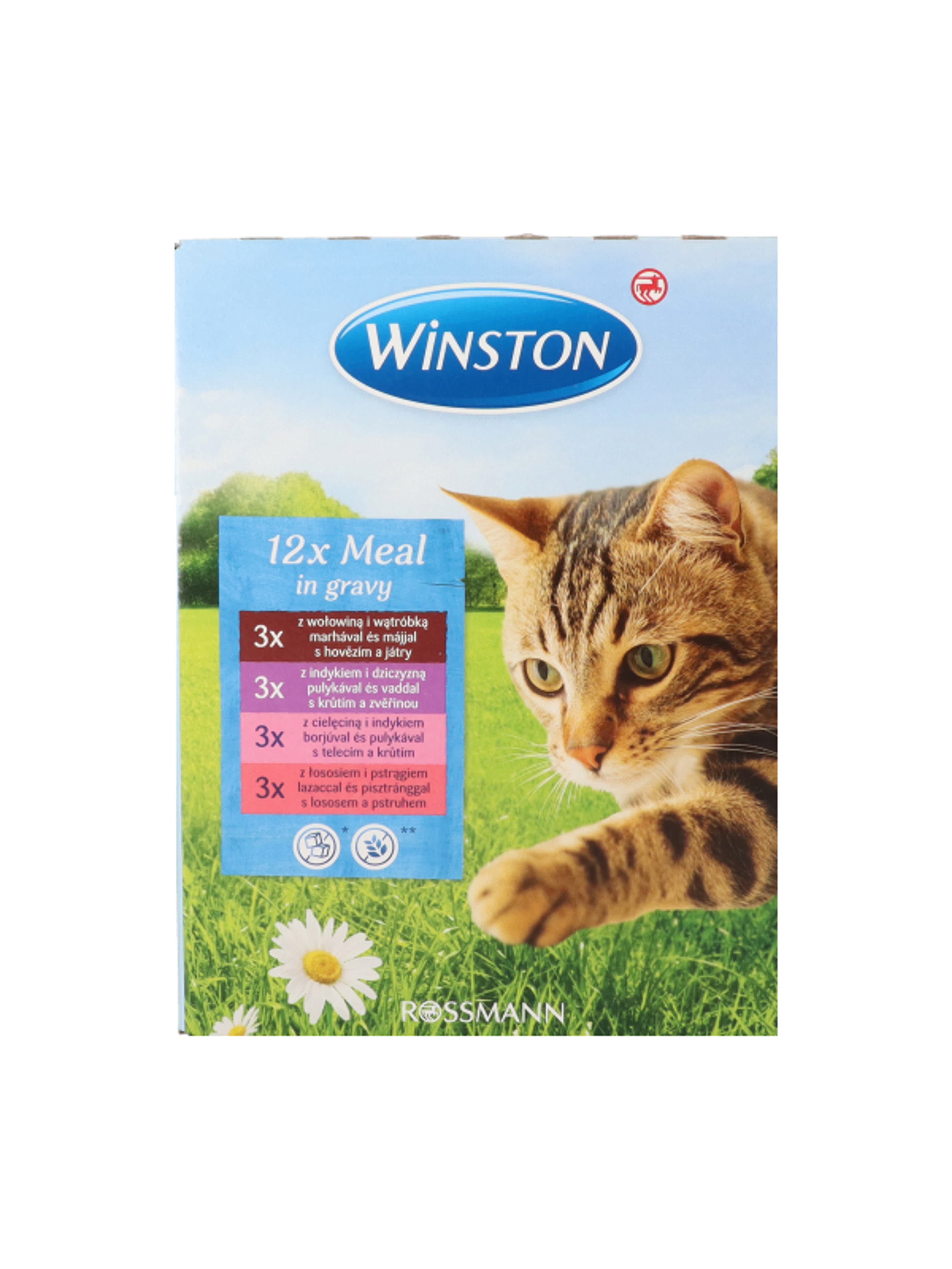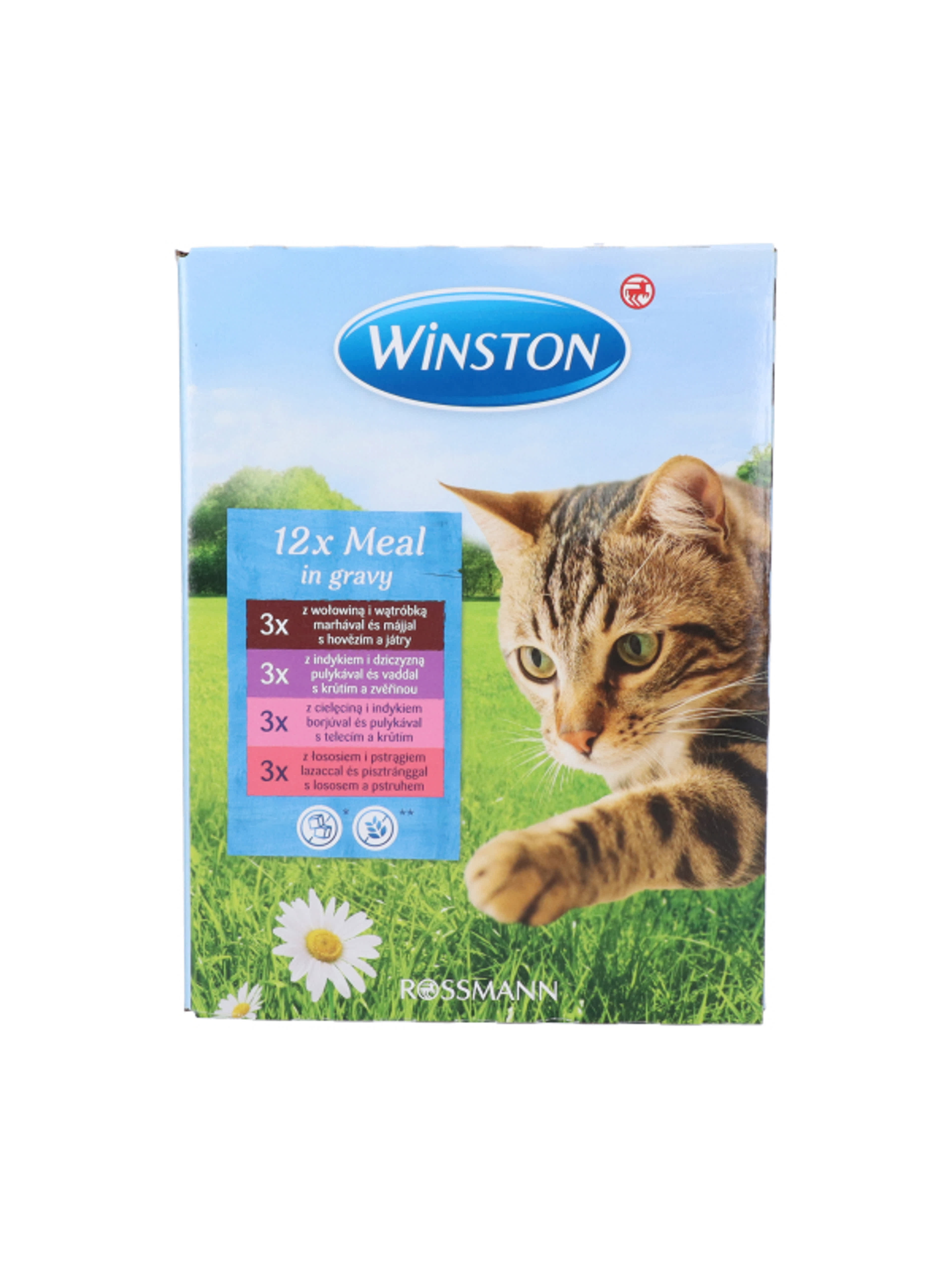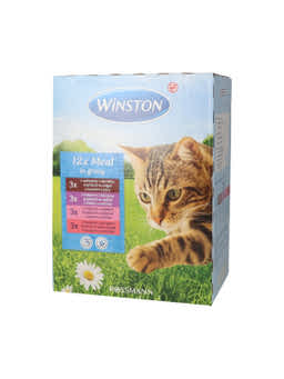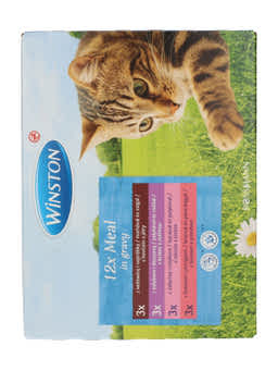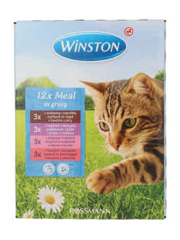 Winston macska fenséges menü multipack szószban 12 x 100g= 1200 gTeljes értékű táplálék felnőtt macskáknakÚj receptúraCukor, tartósítószerek és aroma felhasználása nélkül készült3x marha & májasÖsszetevők: hús és állati melléktermékek (többek között 4% marha, 4% májas), gabona, ásványi anyagok3x vadpulyka & vadasÖsszetevők: hús és állati melléktermékek (többek között 4% vadpulyka, 4% vadhús), gabona, ásványi anyagok3x borjú & pulykaÖsszetevők: hús és állati melléktermékek (többek között 4% borjú, 4% pulyka), gabona, ásványi anyagok3x lazac & pisztrángÖsszetevők: hús és állati melléktermékek, hal és hal melléktermékek (többek között 4% lazac, 4% pisztráng), gabona, ásványi anyagokAnalitikai összetevők: 7,5% nyersprotein, 4,5% nyerszsír, 2,0% nyershamu, 0,3% nyersrost, 82,5% nedvességtartalomAdalékanyagok kg-onként: táplálkozásfiziológiai adalékanyagok:A-vitamin 2000 IE, D3-vitamin 200 IE, 20mg E-vitamin, 12 mg cink (mint cink-szulfát, monohidrát), 300 mg taurinA Winston macska menüt a legújabb tudományos ismeretek alapján fejlesztették ki és kifejezetten az Ön macskájának igényeihez igazították. A benne lévő taurin hozzájárul a látás minőségének javításához, valamint a szívizomzat erősítéséhez. Etetési javaslat: Egy kifejlett, átlagos macska (4kg) napi mennyiségi igénye 280-310g, több étkezésre elosztva. Ezek az adagok irányadó értékek. Az egyéni szükségelt több tényezőtől is függhet úgy mint például a fajta, kor, aktivitás és tartási körülmények. Kérjük, szobahőmérsékleten kínálja macskájának