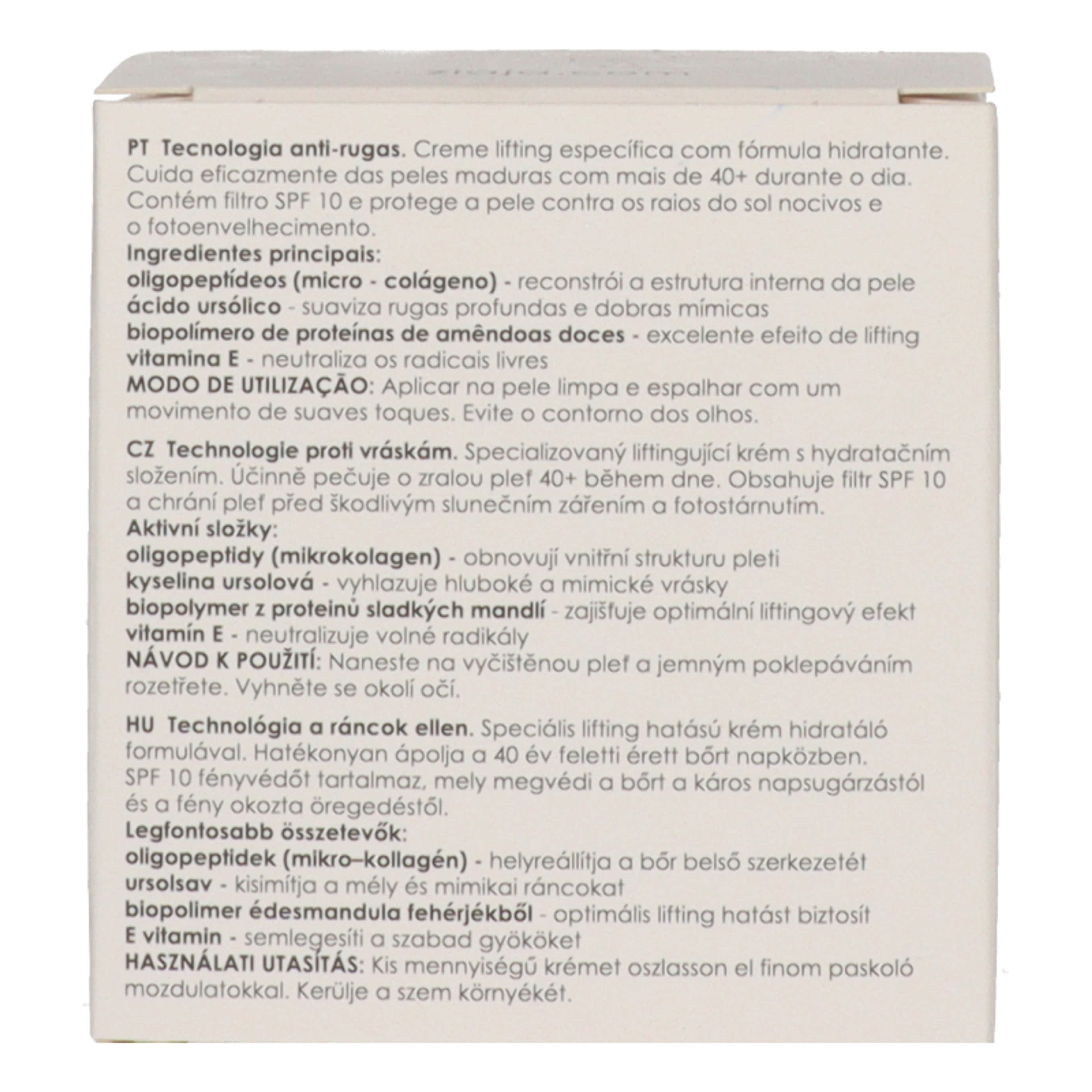 Nanotechnológia a ráncok ellen, boremelés és fényvédelem egyben - száraz, rugalmasságot vesztett bortípusra 40 év felett. Speciális, emelo hatású krém hidratáló formulával. Hatékonyan ápolja a nap folyamán az érett bort. 10-es fényvédo faktorú szurovel védi a bort a káros napsugárzástól és a fény által okozott öregedéstol. Segít újraépíteni a bor belso szerkezetét, kisimítja a mély és a mimikai ráncokat egyaránt. Borsemleges pH-értéku, borgyógyászatilag és allergológiailag tesztelt.Összetevok Aqua (Water), C12-15 Alkyl Benzoate, Triethylhexanoin, Glyceryl Stearate, PEG-100 Stearate, Glycerin, Ethylhexyl Triazone, Dimethicone, Aluminum Starch Octenylsuccinate, Butyl Methoxydibenzoylmethane, Cetyl Alcohol, Butylene Glycol, Carbomer, Polysorbate 20, Palmitoyl Tripeptide-1, Palmitoyl Tetrapeptide-7, Hydrogenated Coco-Glycerides, Hydrolyzed Rice Protein, Prunus Amygdalus Dulcis (Sweet Almond) Seed Extract, Butyrospermum Parkii (Shea) Butter, Hydroxyethyl Acrylate/Sodium Acryloyldimethyl Taurate Copolymer, Methylene Bis-Benzotriazolyl Tetramethylbutylphenol (nano), Propylene Glycol, Panthenol, Tocopheryl Acetate, Phospholipids, Ursolic Acid, Zea Mays (Corn) Kernel Extract, Hydroxyacetophenone, Methylparaben, Parfum (Fragrance), Limonene, Alpha-Isomethyl Ionone, Linalool, Amyl Cinnamal.